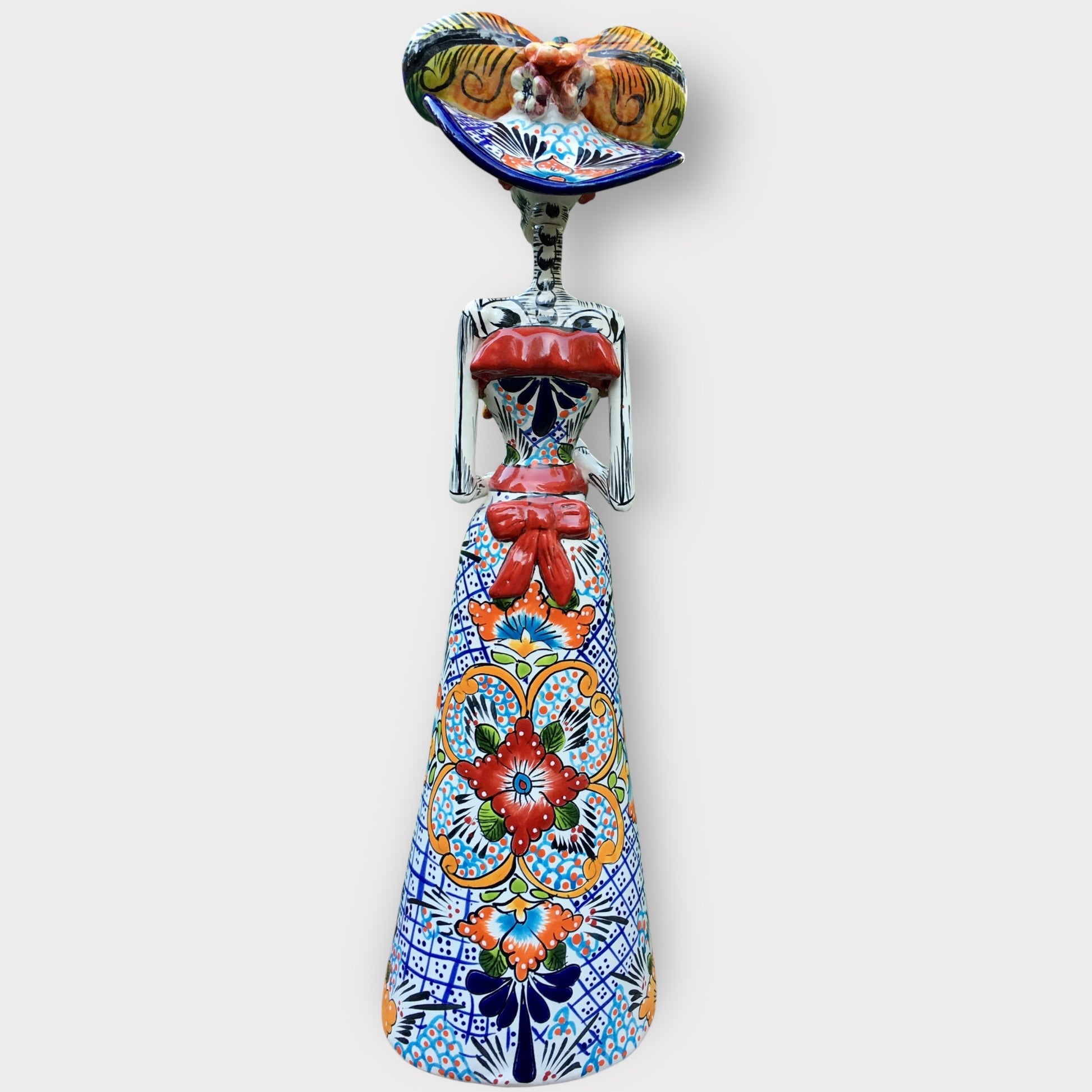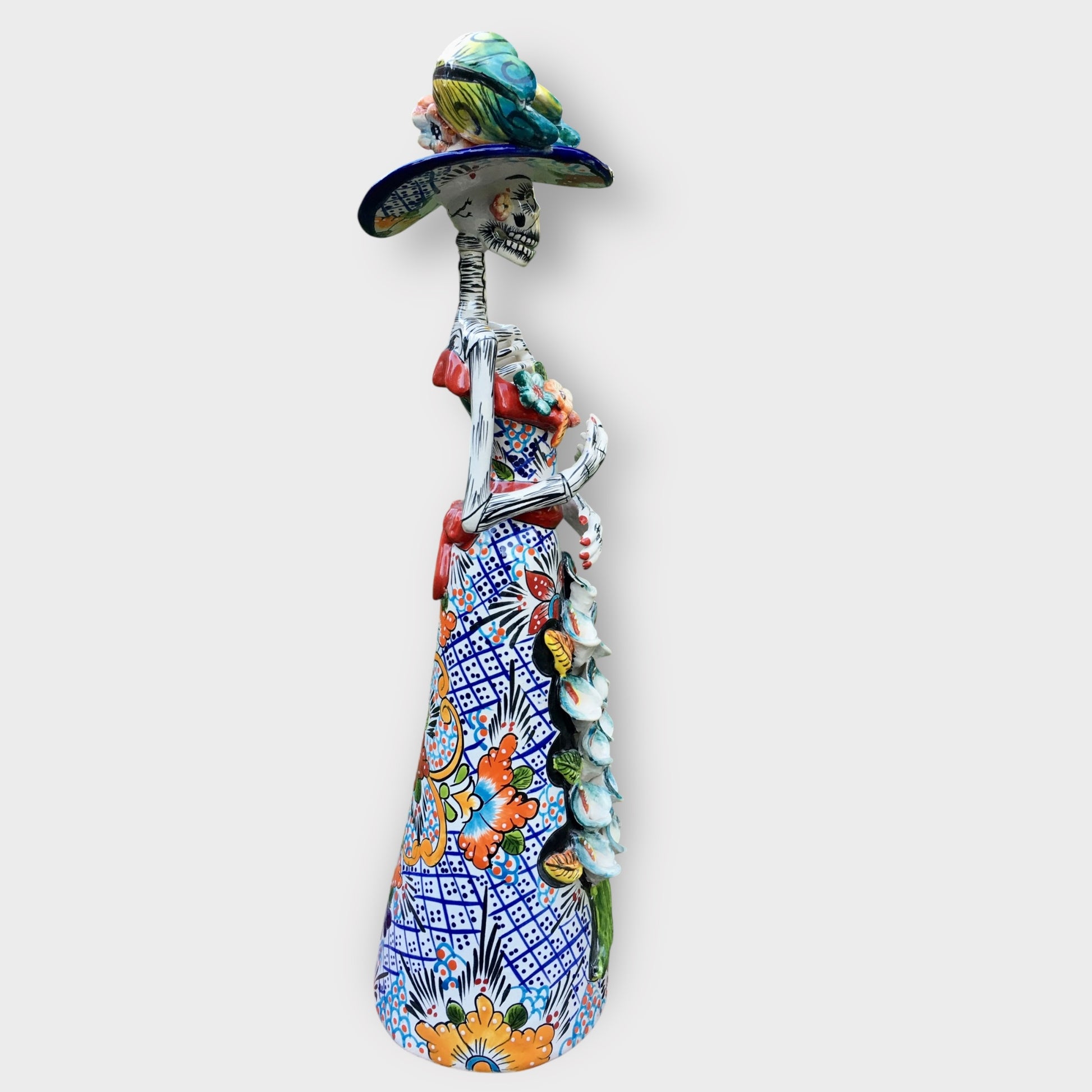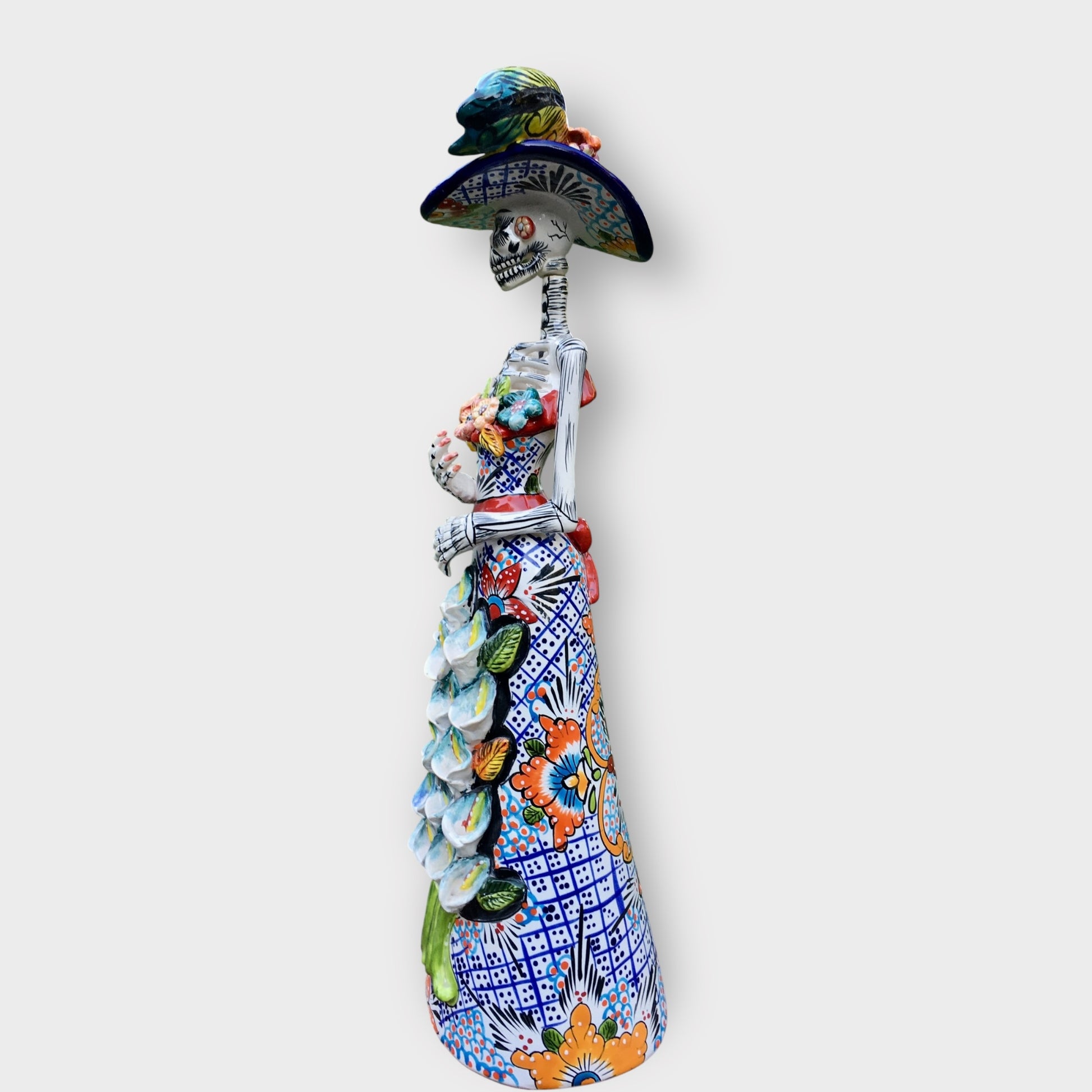 Our beautifully crafted Talavera Catrina with Cala Lilies is stunning, look at all those flowers! This lovely lady is part Gerardo Garcia’s festive Dia dos Muertos (Day of the Dead) collection. A must have for the Day of the Dead Collector. Made in Dolores Hidalgo, Guanajuato, Mexico.