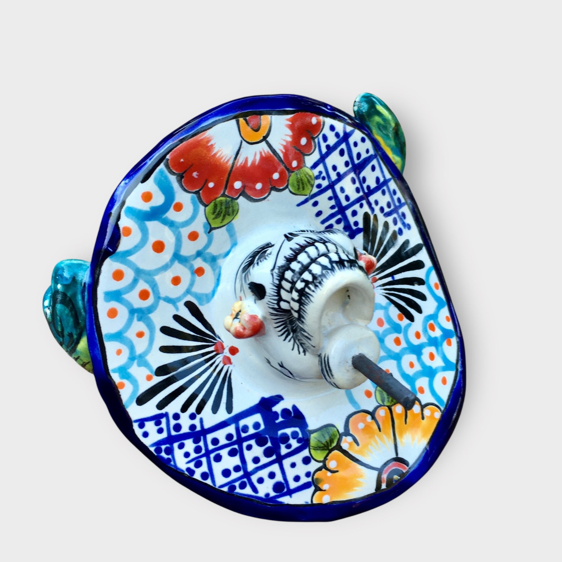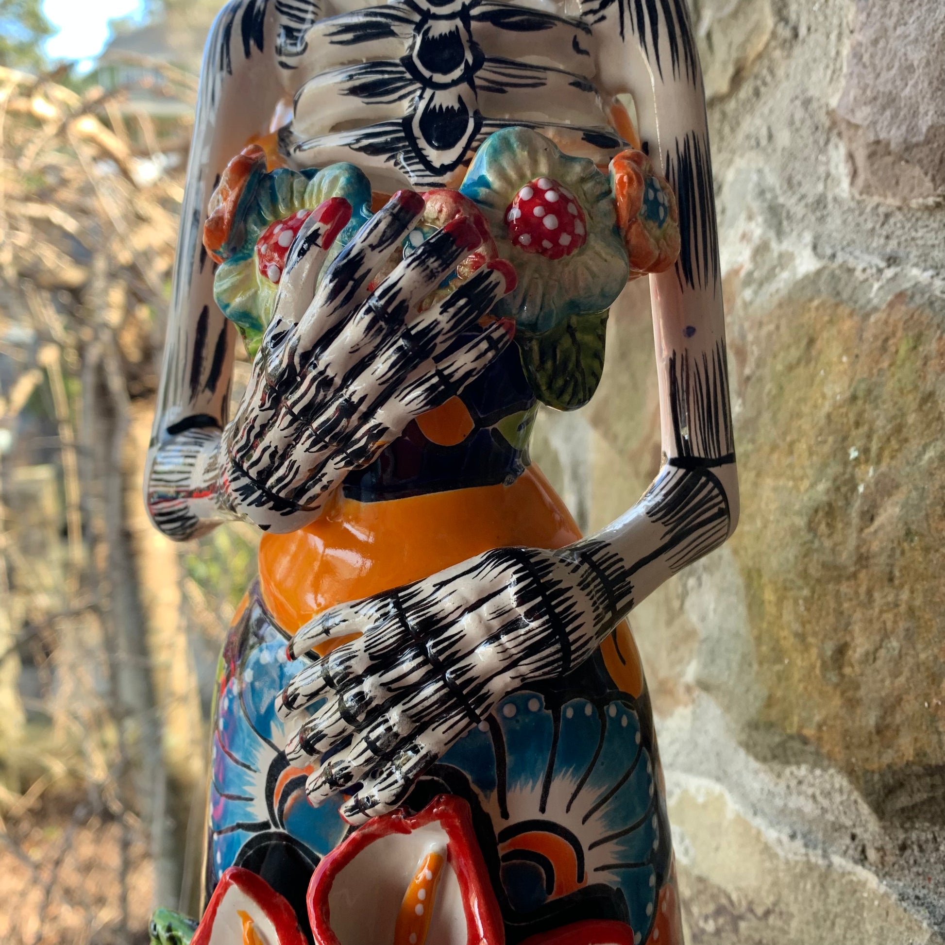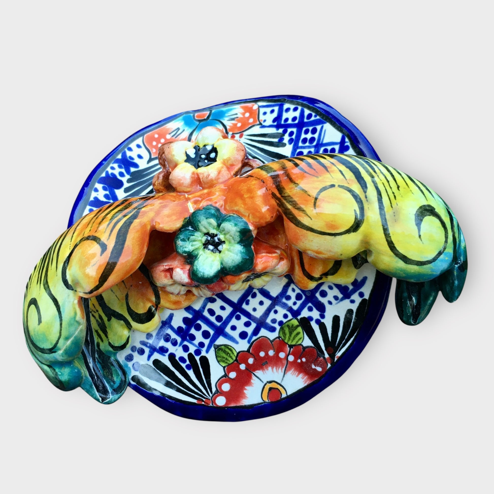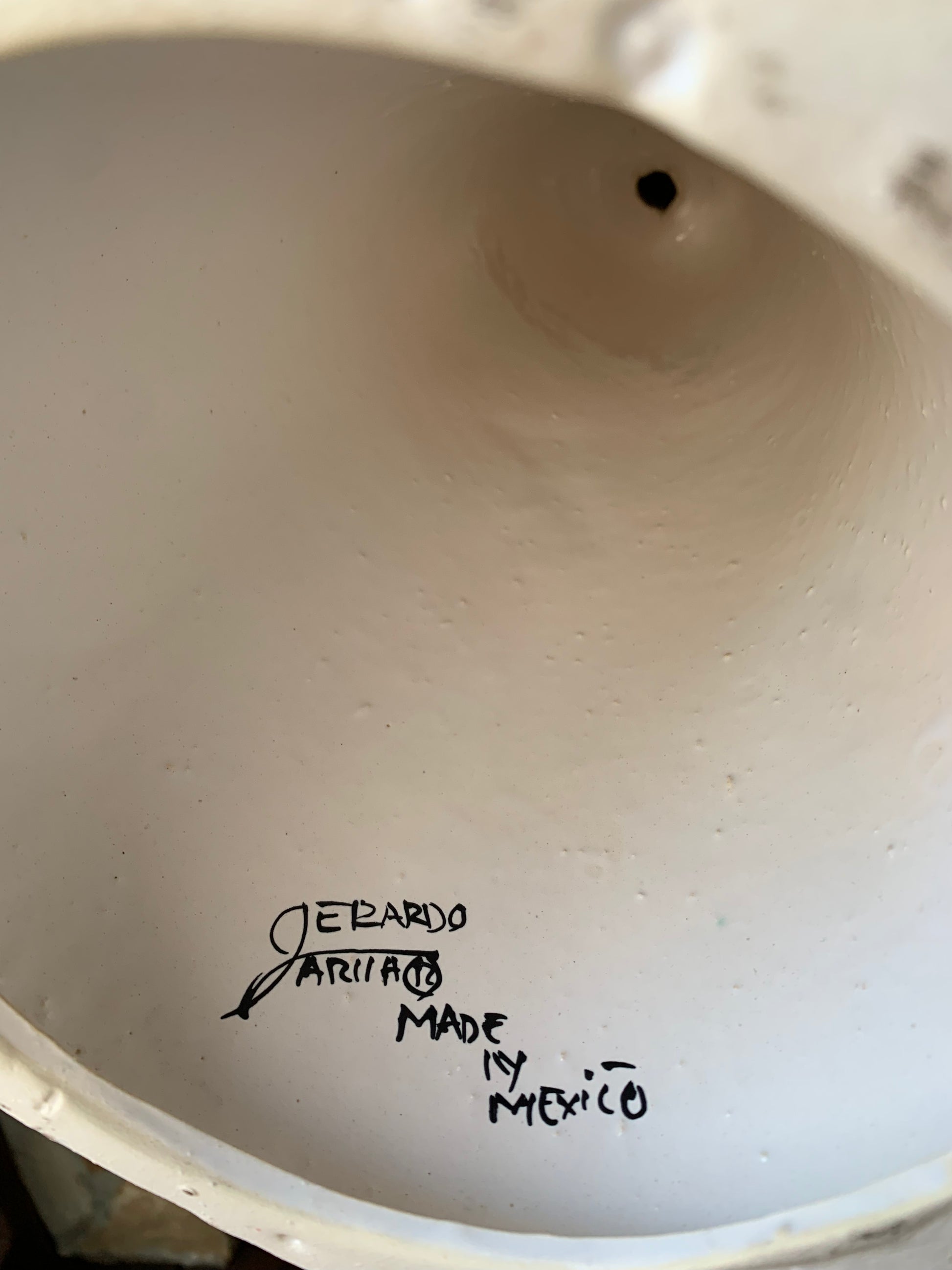 Our beautifully crafted Talavera Catrina with Cala Lilies is stunning, look at all those flowers! This lovely lady is part Gerardo Garcia’s festive Dia dos Muertos (Day of the Dead) collection. A must have for the Day of the Dead Collector. Made in Dolores Hidalgo, Guanajuato, Mexico.