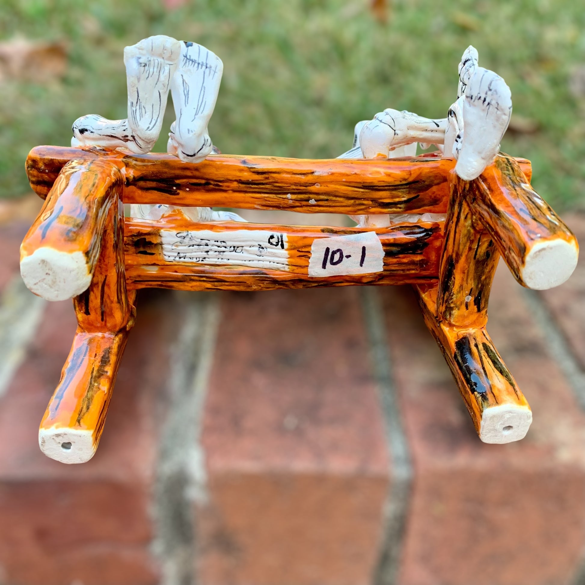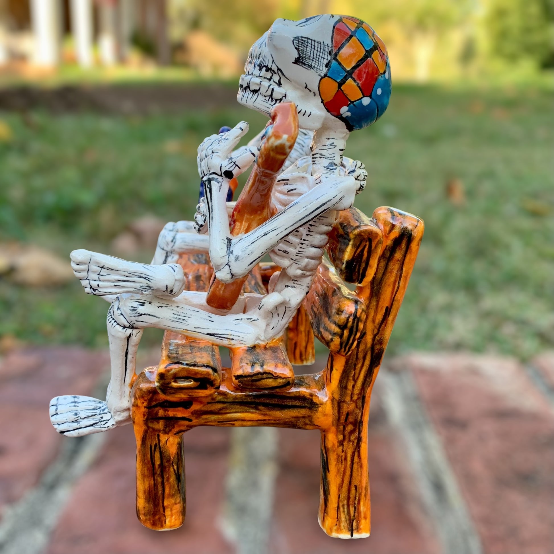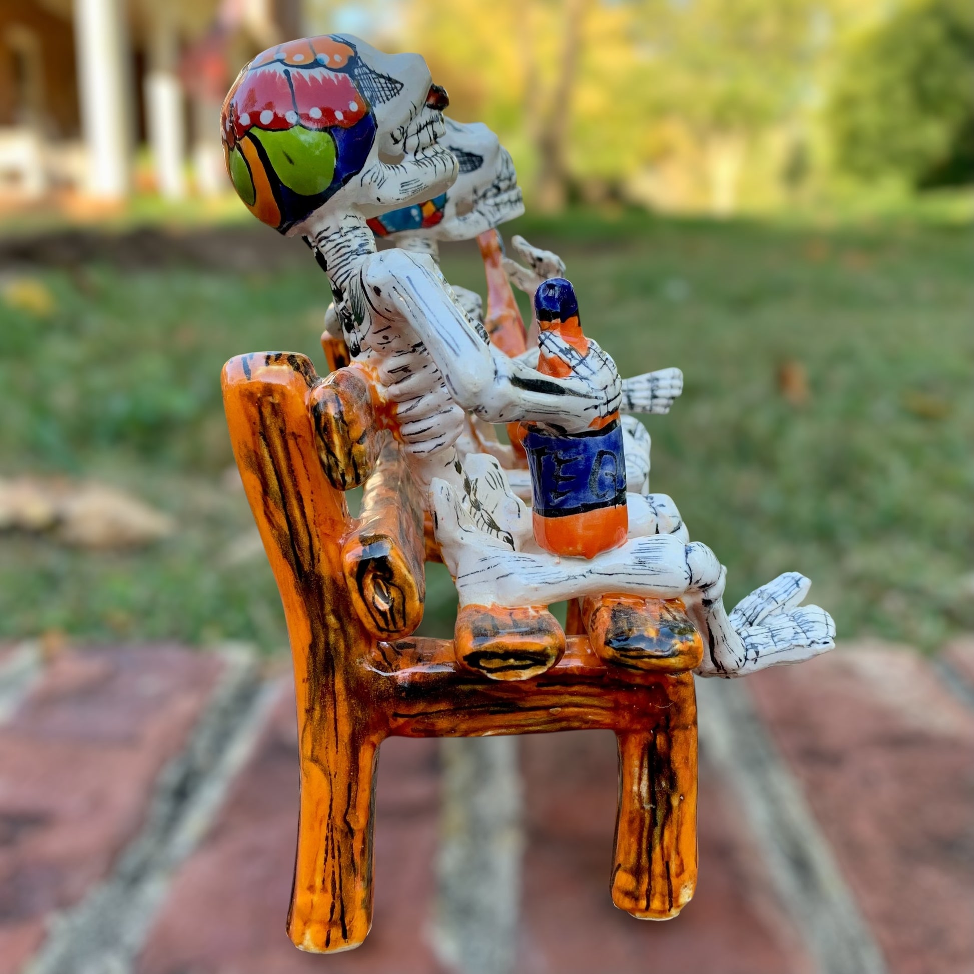 Our Crazy Talavera Amigos on a bench are enjoying each other’s company. One amigo is happily playing his guitar while the other enjoys his tequila, fun! A must have for the Day of the Dead Collector (Dia de Los Muertos). Made in Dolores Hidalgo, Guanajuato, Mexico.