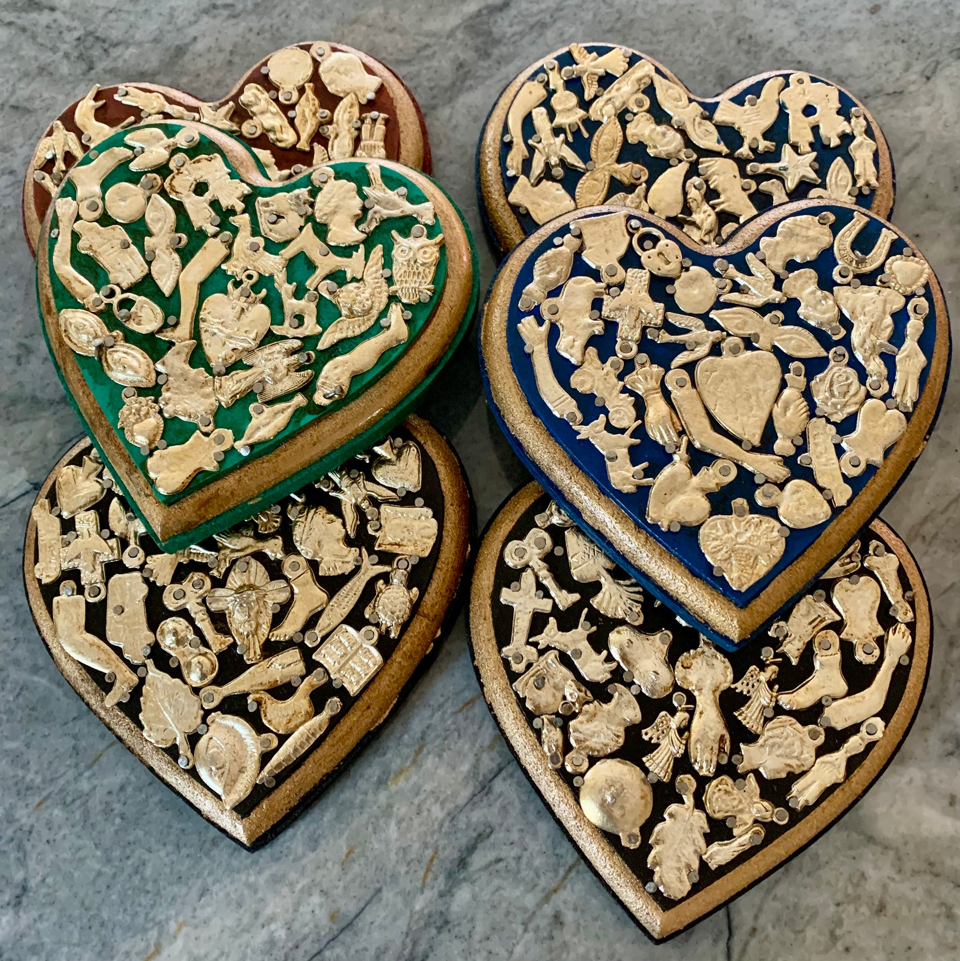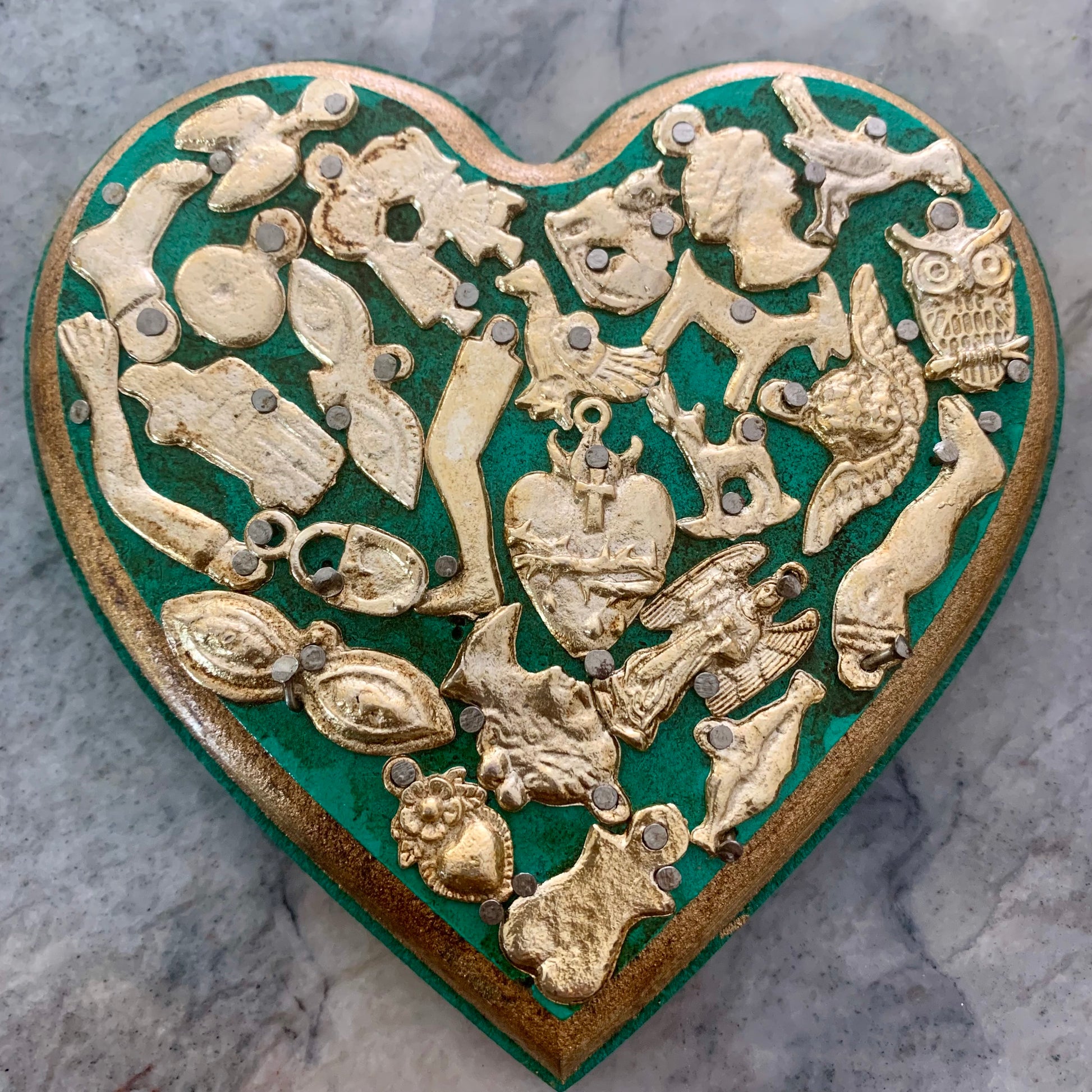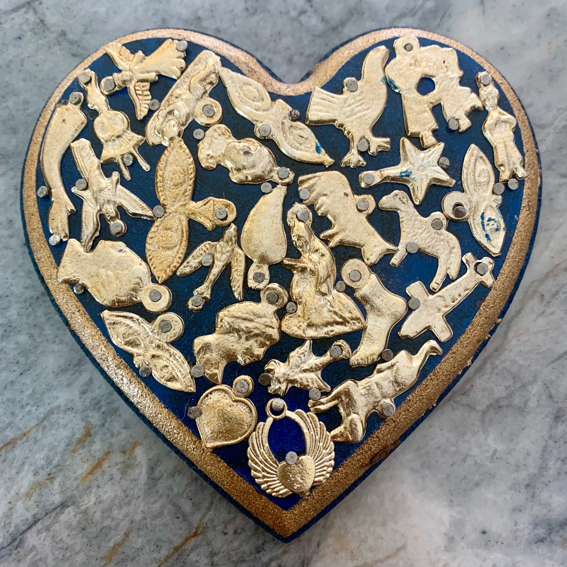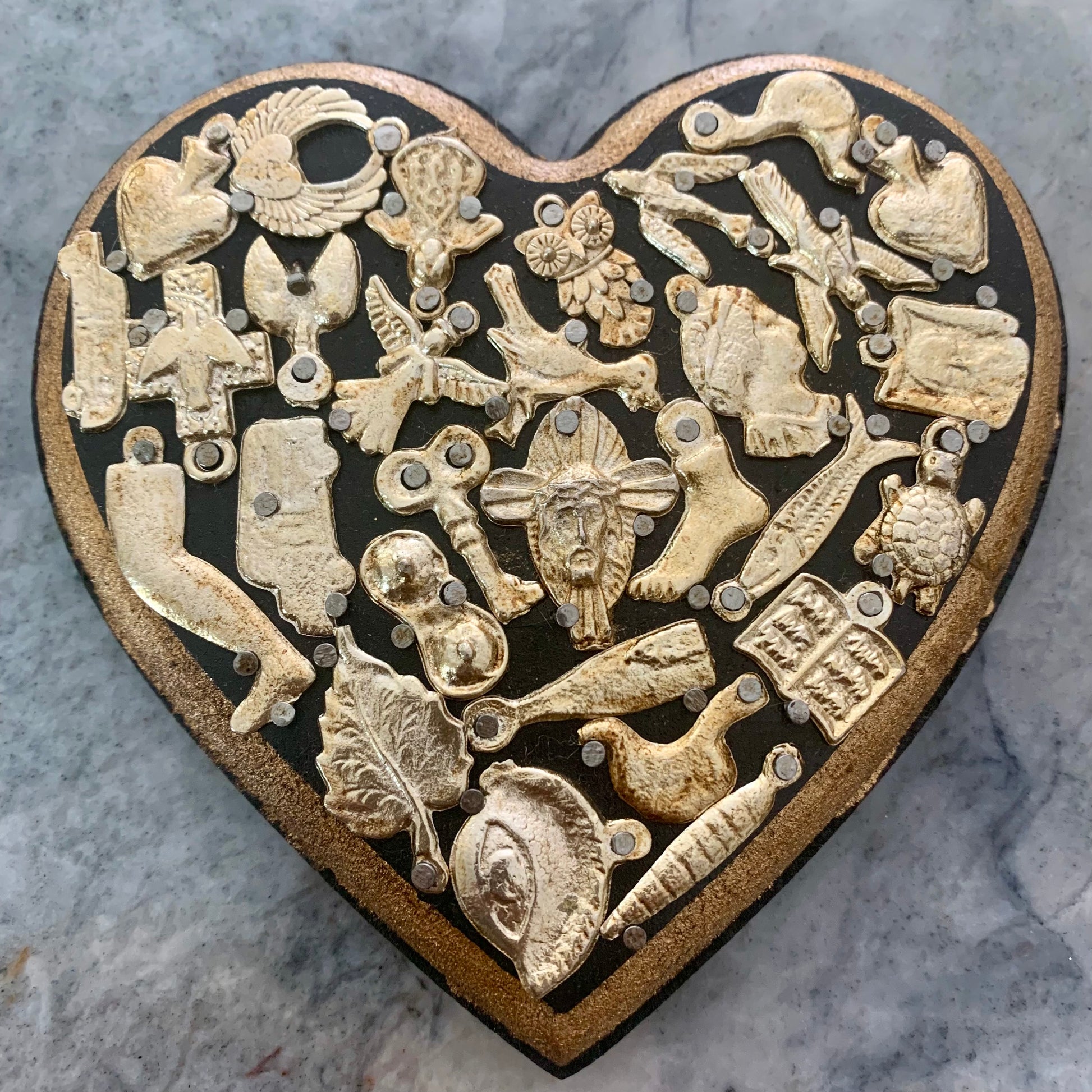 SHIPS FREE! Our wooden Plano Heart celebrates the rich tradition of Mexican Milagros. Each heart is adorned with authentic milagro decorations, these one-of-a-kind pieces make meaningful spiritual gifts for those seeking connection to their faith or cultural heritage. Perfect for altar displays, meditation spaces, or as a heartfelt token of love and protection. Handcrafted in Tonala, Jalisco,