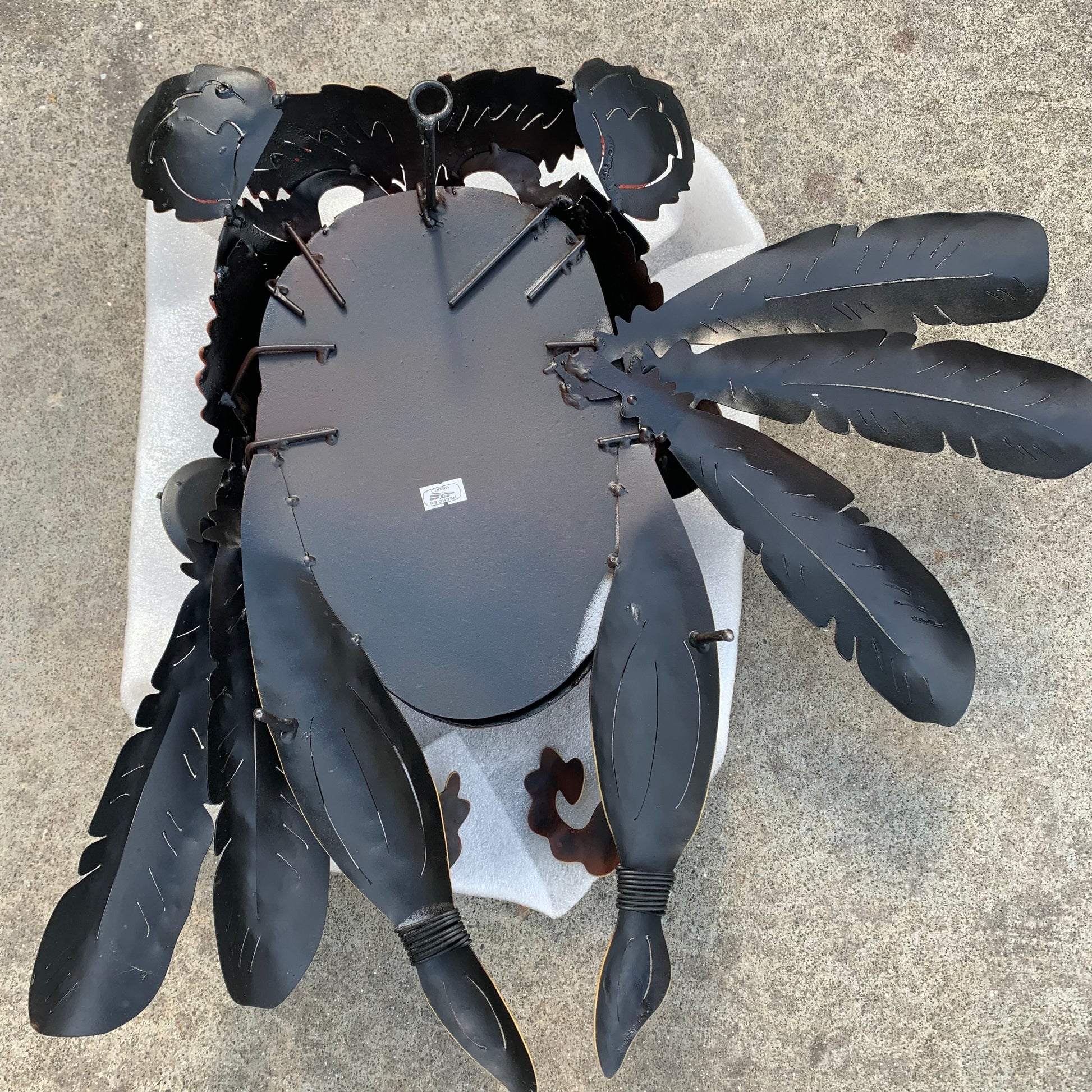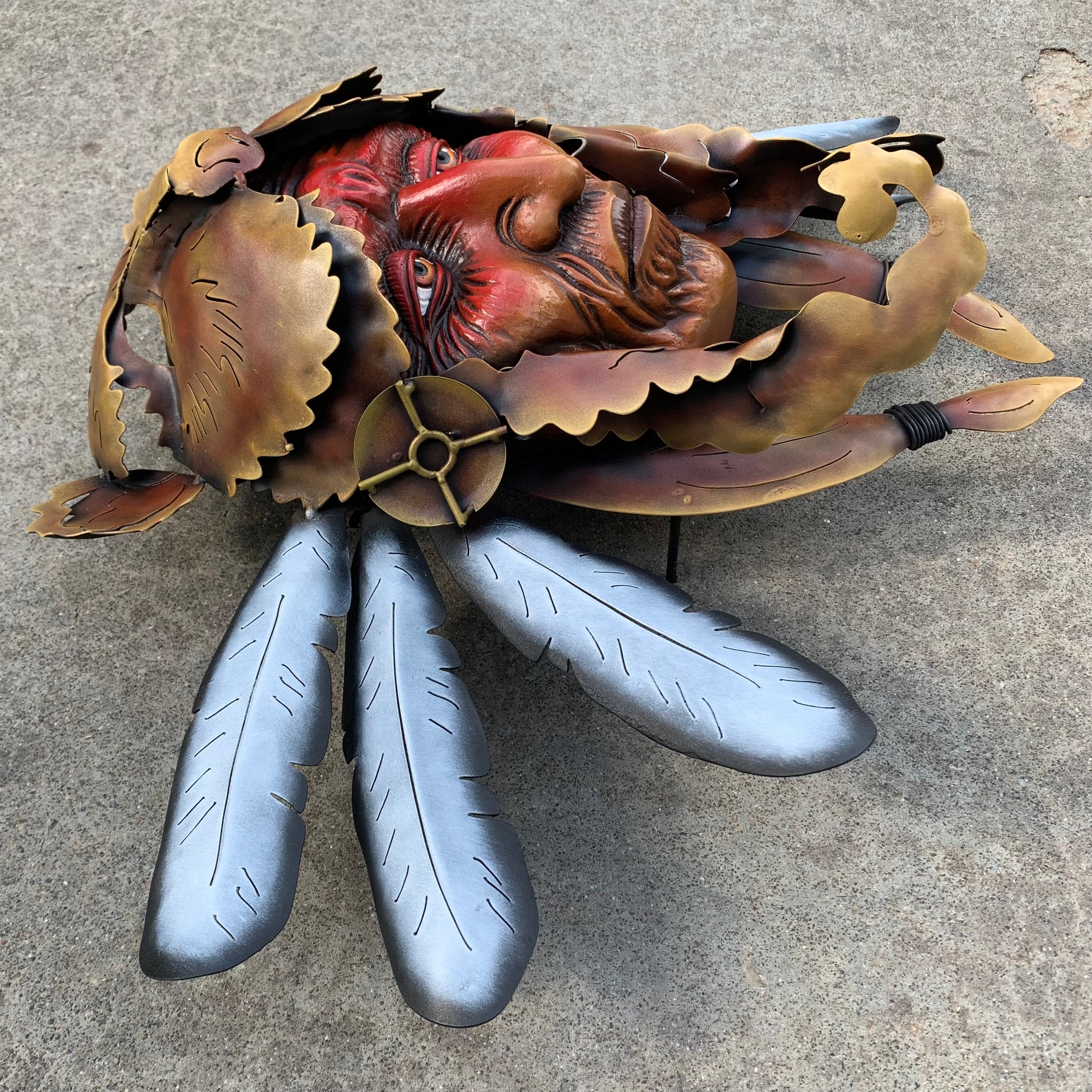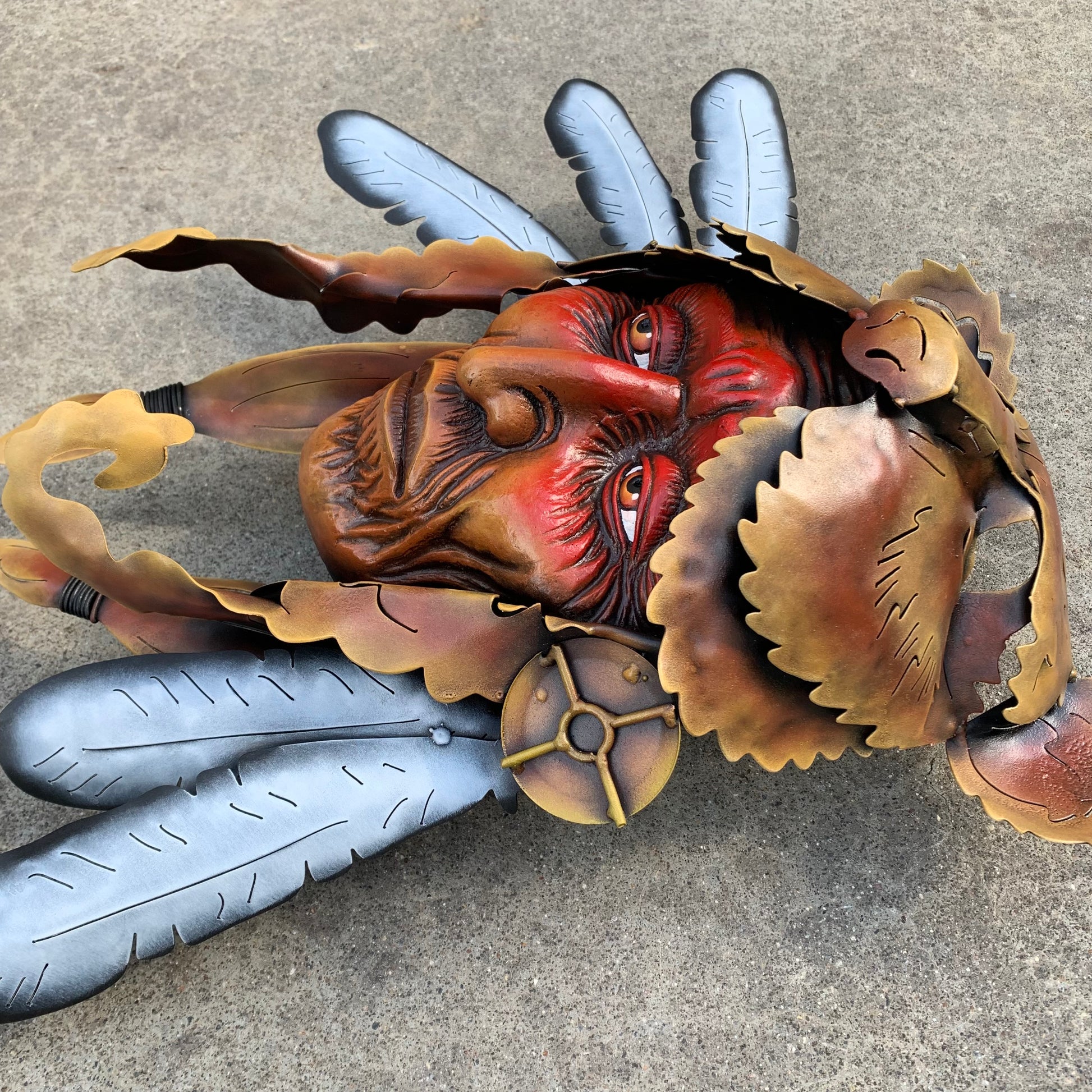 Our handcrafted Indian Face is amazing! His headdress is topped off with the silhouette of a bear head and flowing feathers. Take a look at the stunning detail in the warriors face and eyes. The face is sculpted out of clay, the artwork surrounding the face is crafted out of metal. The face is three dimensional and very easy to hang, weights approximately 4 pounds, 6 ounces. Made in Jalisco, Mexico.