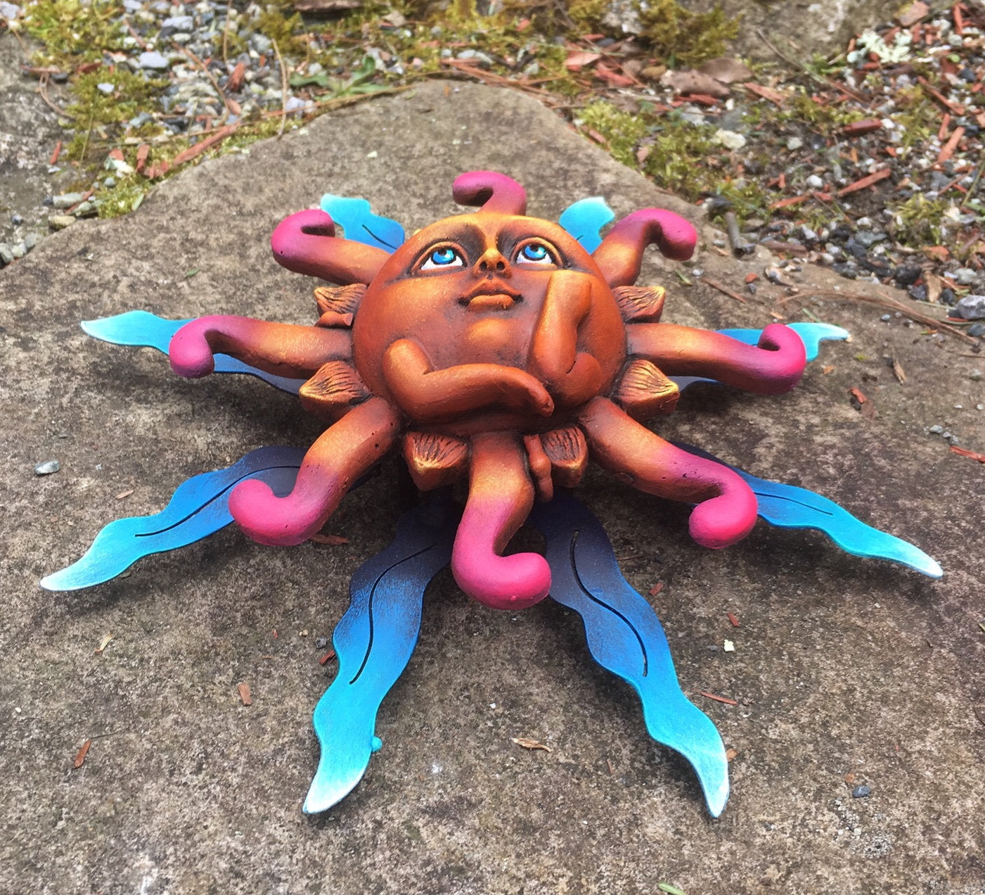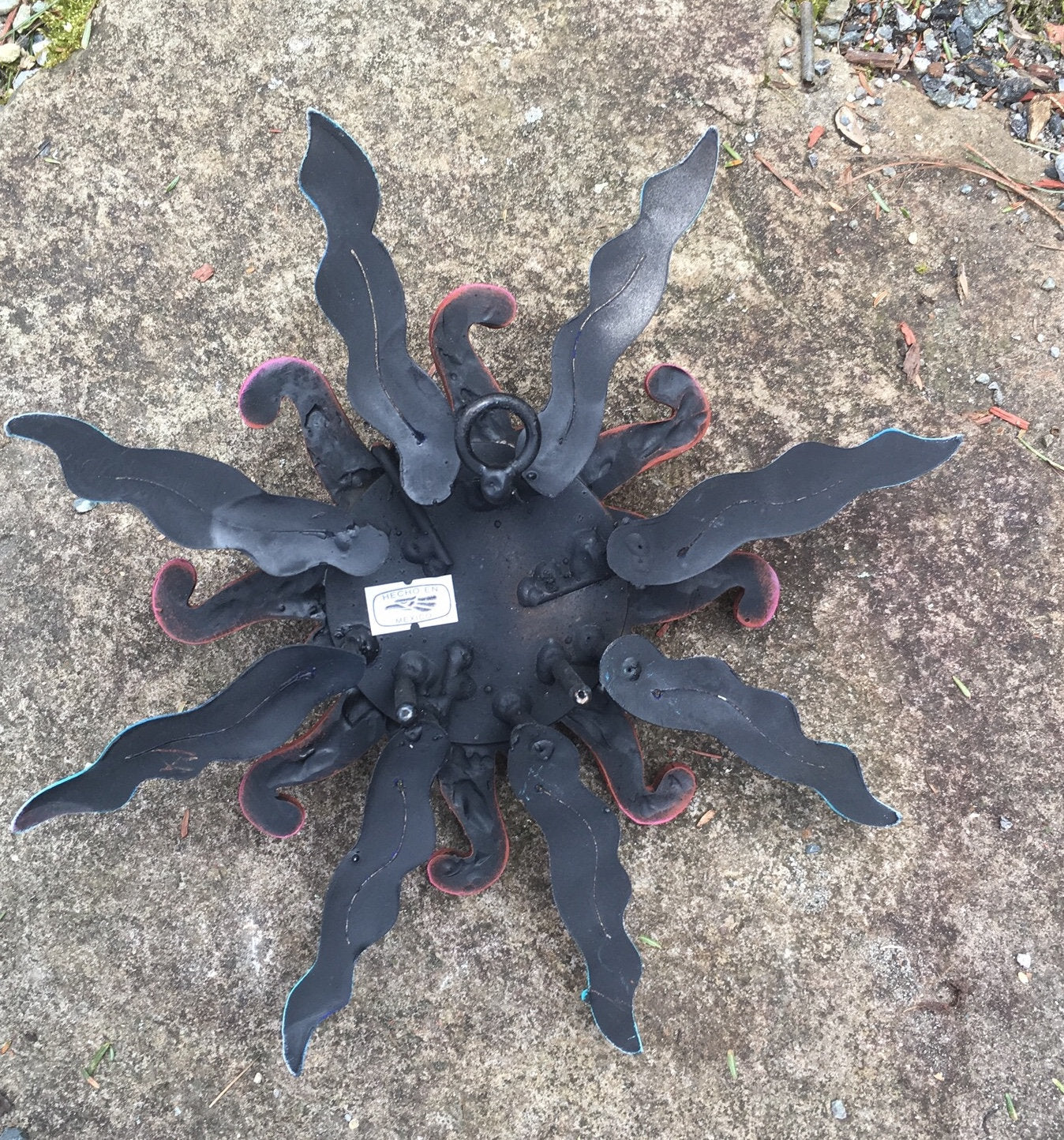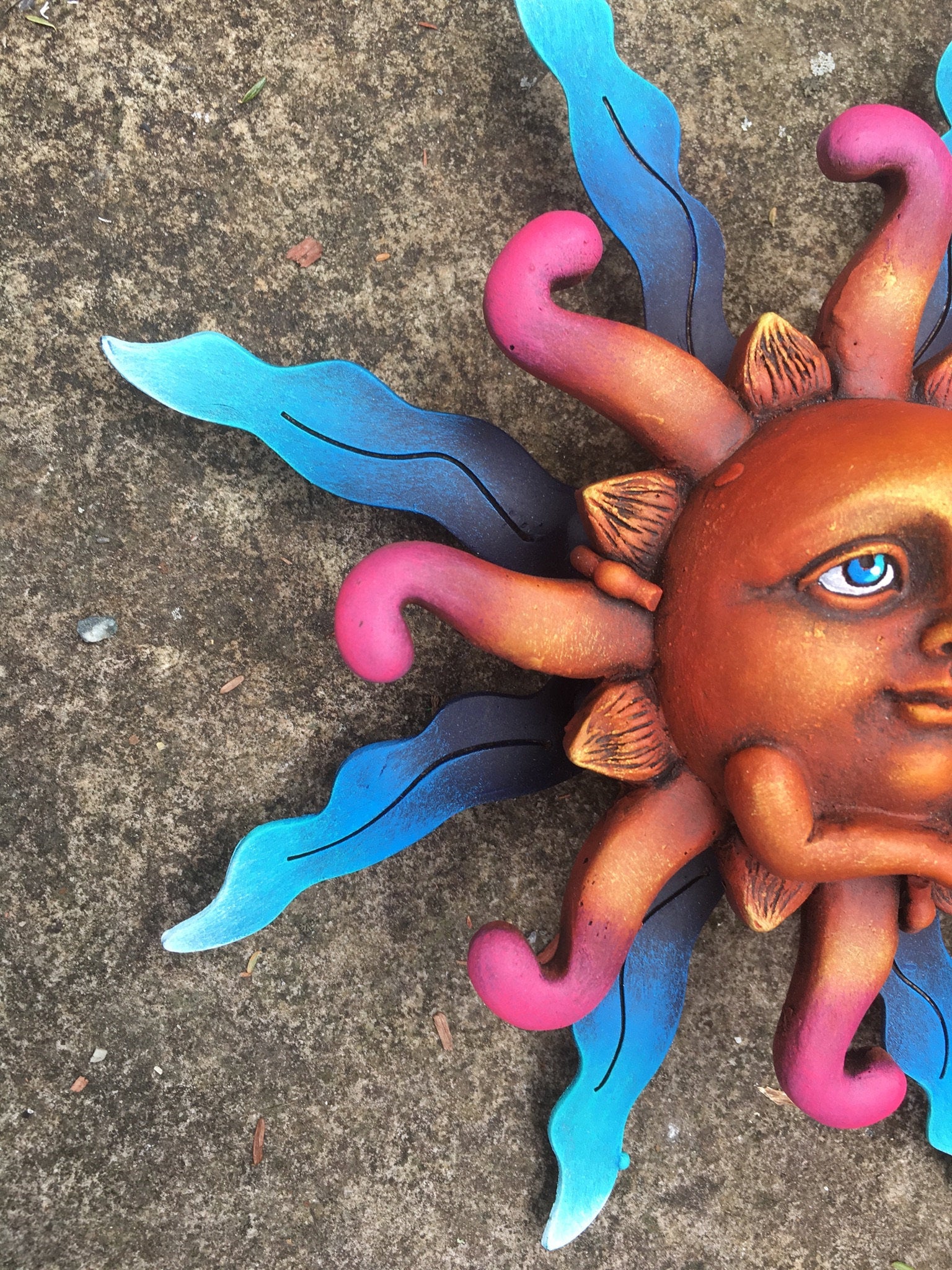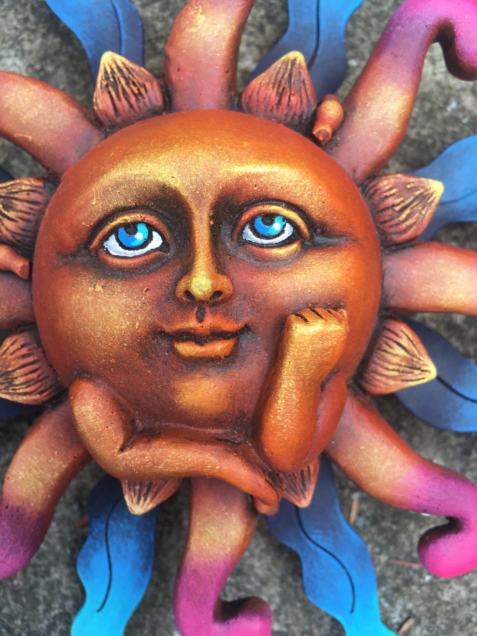 This sweet Sun face looks very deep in thought! How unique to have the arms posed. Our sun is crafted with painted metal rays and a fiberglass Sun face. May be enjoyed indoors and outdoors. Has a loop on back for easy hanging. This piece is light weight and easy to hang. Made in Tonala, Jalisco, Mexico Sun #12B