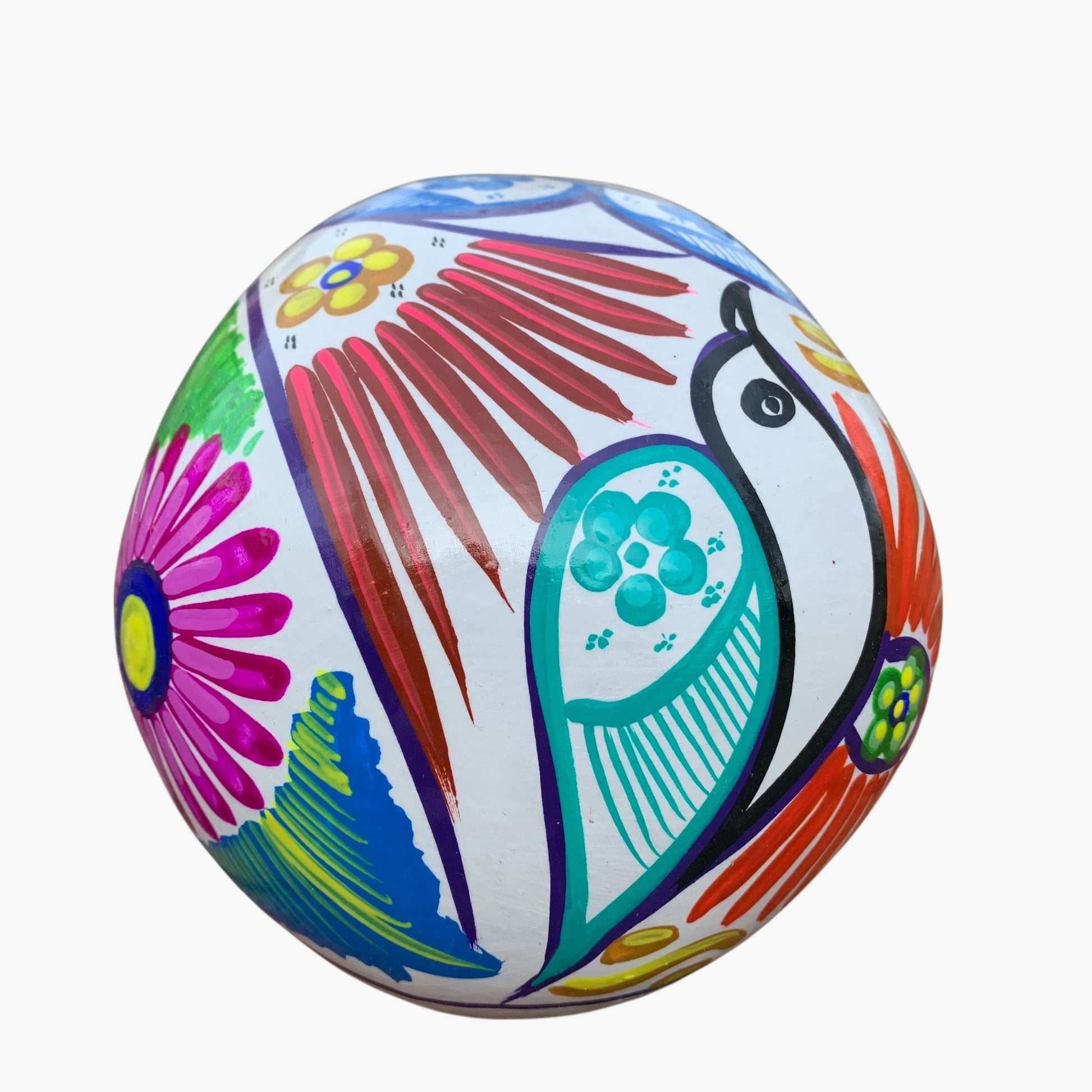 Our cheerfully painted Mexican Sugar Skull Luminera is a popular decoration for Dia de Los Muertos, Day of the Dead.   The bottom is cut in a circle to accommodate a battery operated candle.  The cut outs in the skull will allow the light to shine through.  Very expertly crafted! Made in Guanajuato, Mexico.
