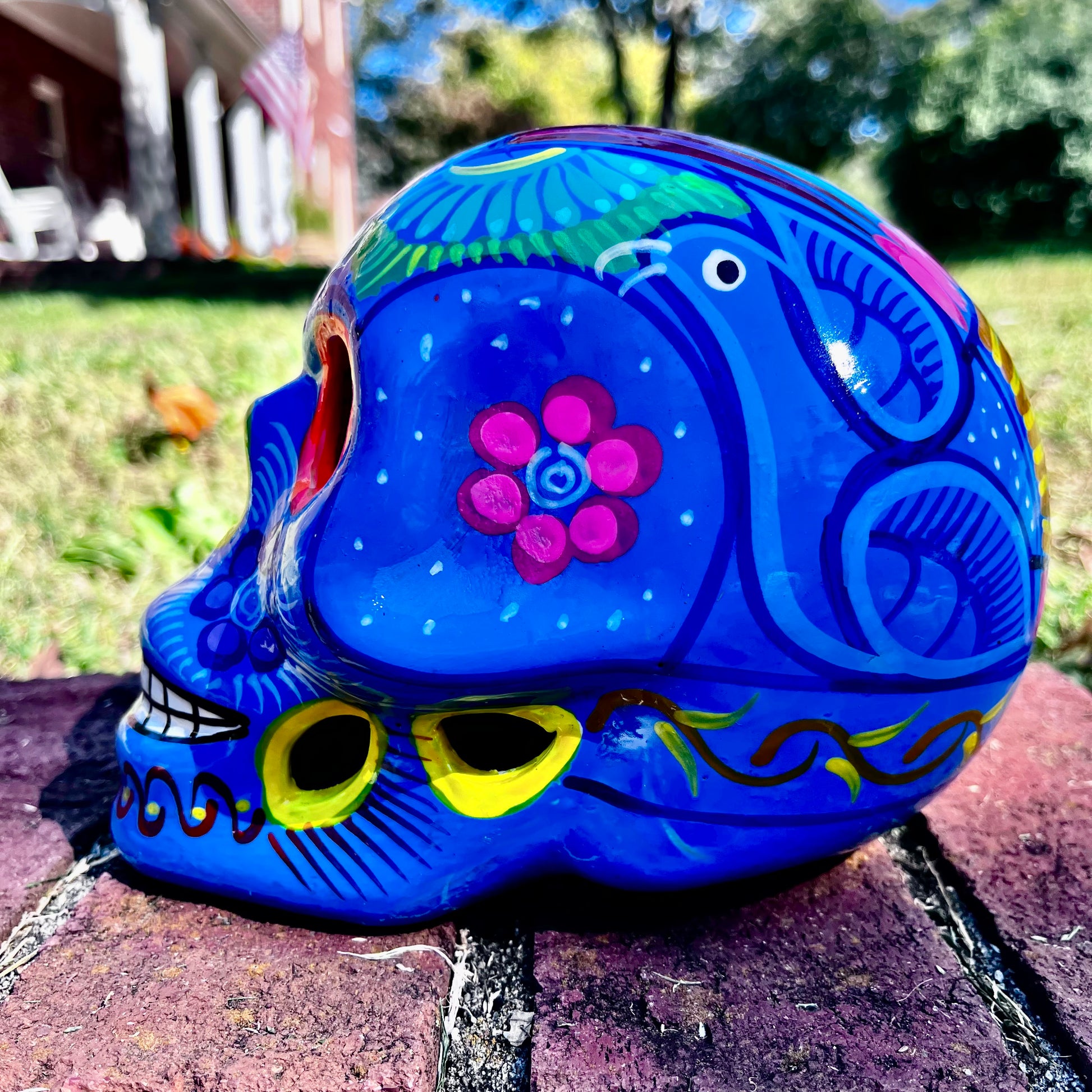 Our cheerfully painted Mexican Sugar Skull is a popular decoration for Dia de Los Muertos, Day of the Dead. Very expertly crafted! Made in Guanajuato, Mexico.