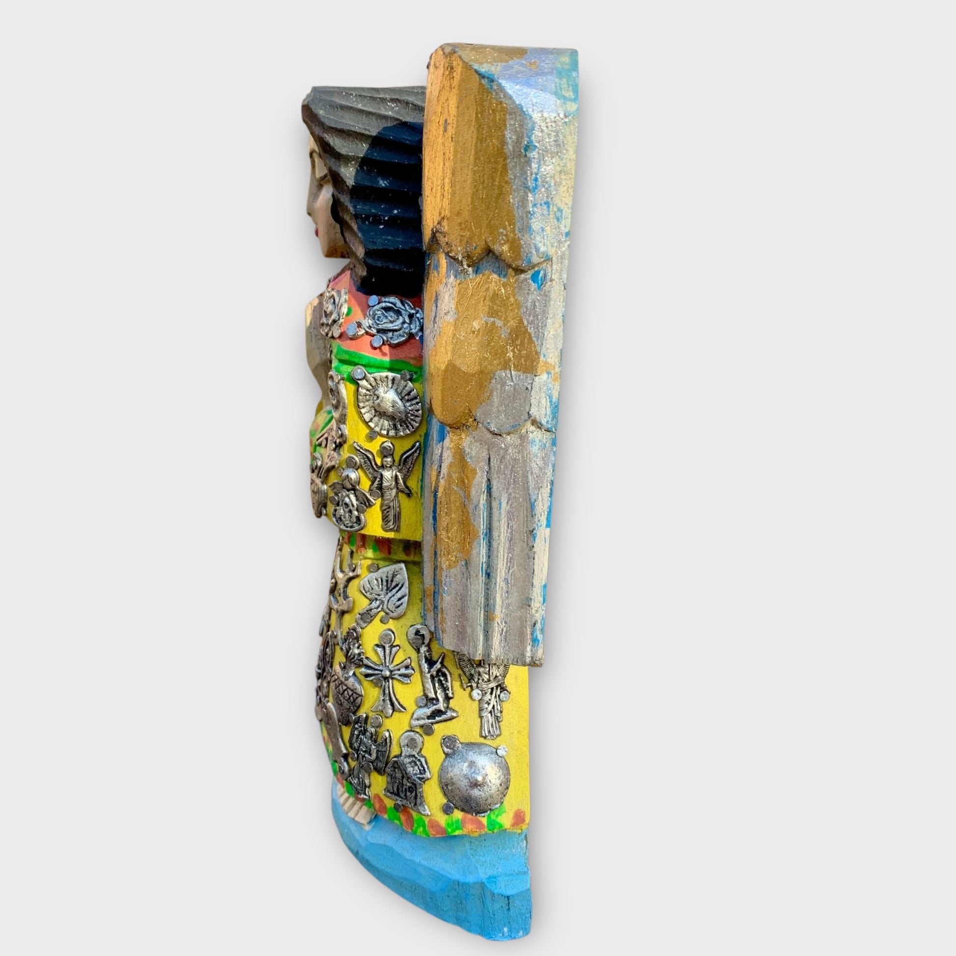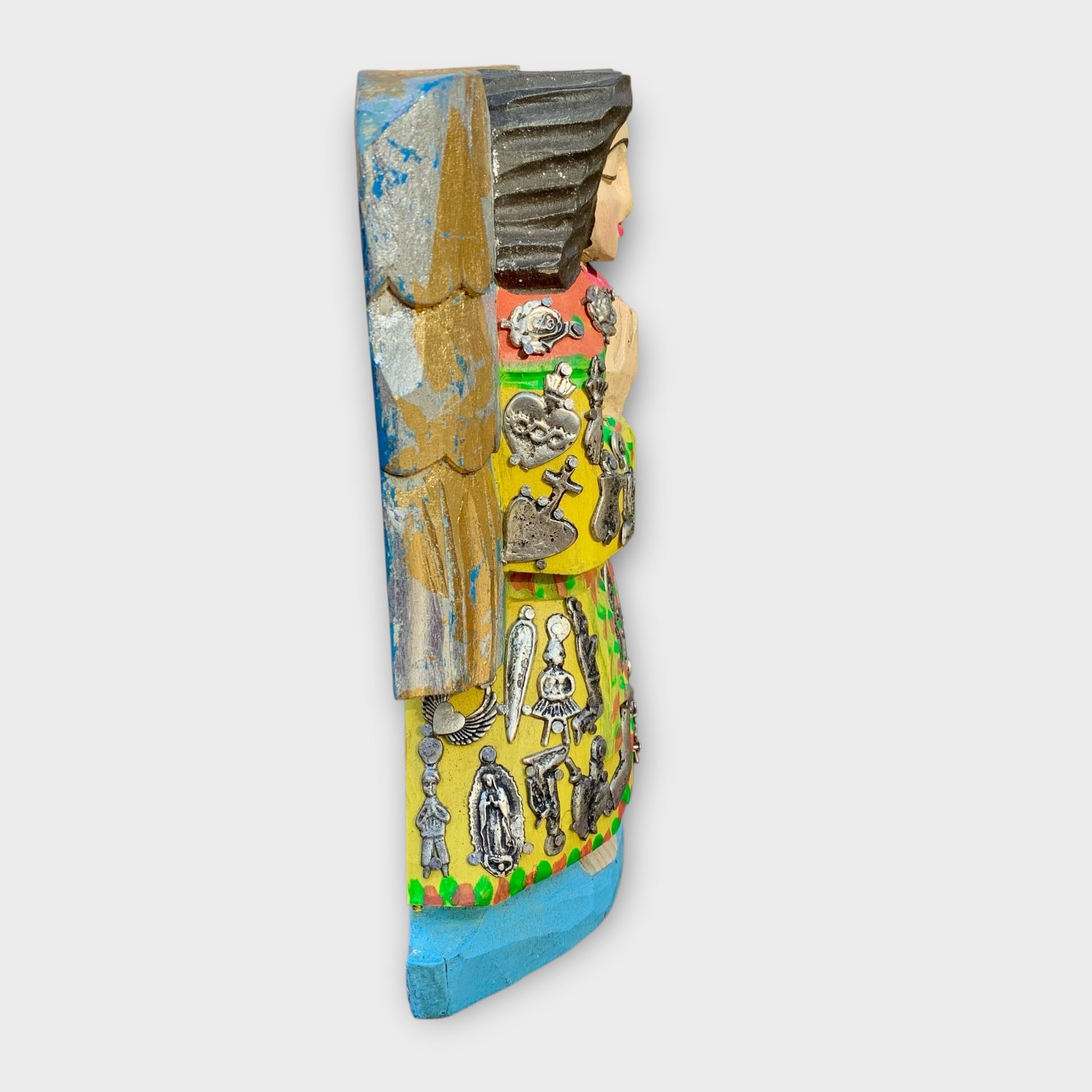 These Mexican handicrafts are made on pieces of wood decorated with metal figures know as "Milagros". This is an old religious tradition, giving thanks for the gifts of the heavens. This craft is represented as Mexican Folk Art. Irregularity in color and shape are characteristics of this craft.