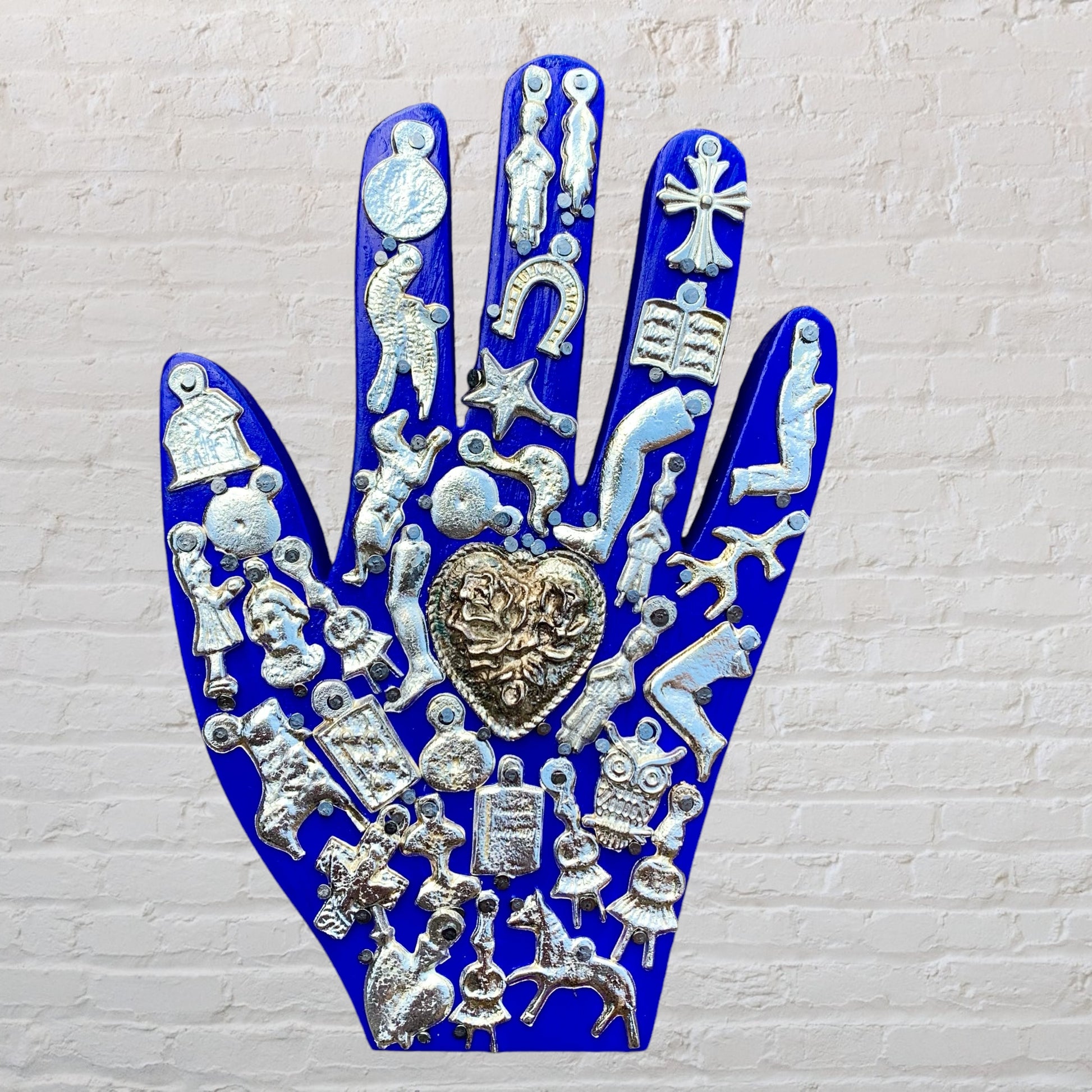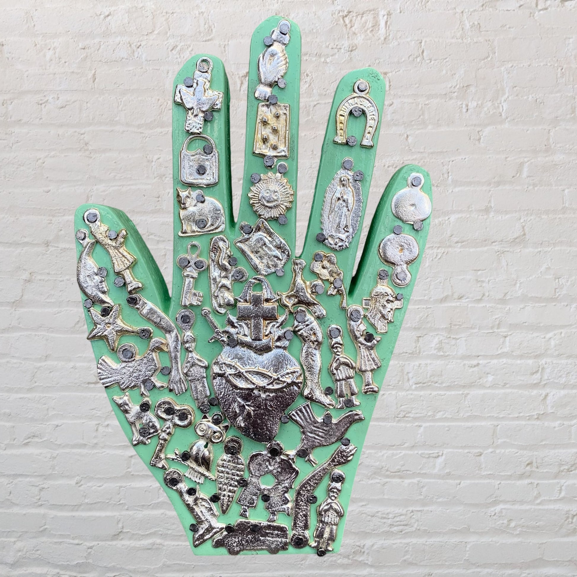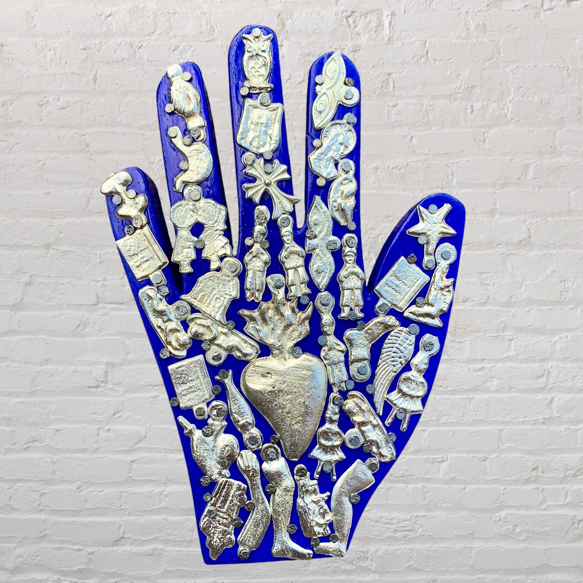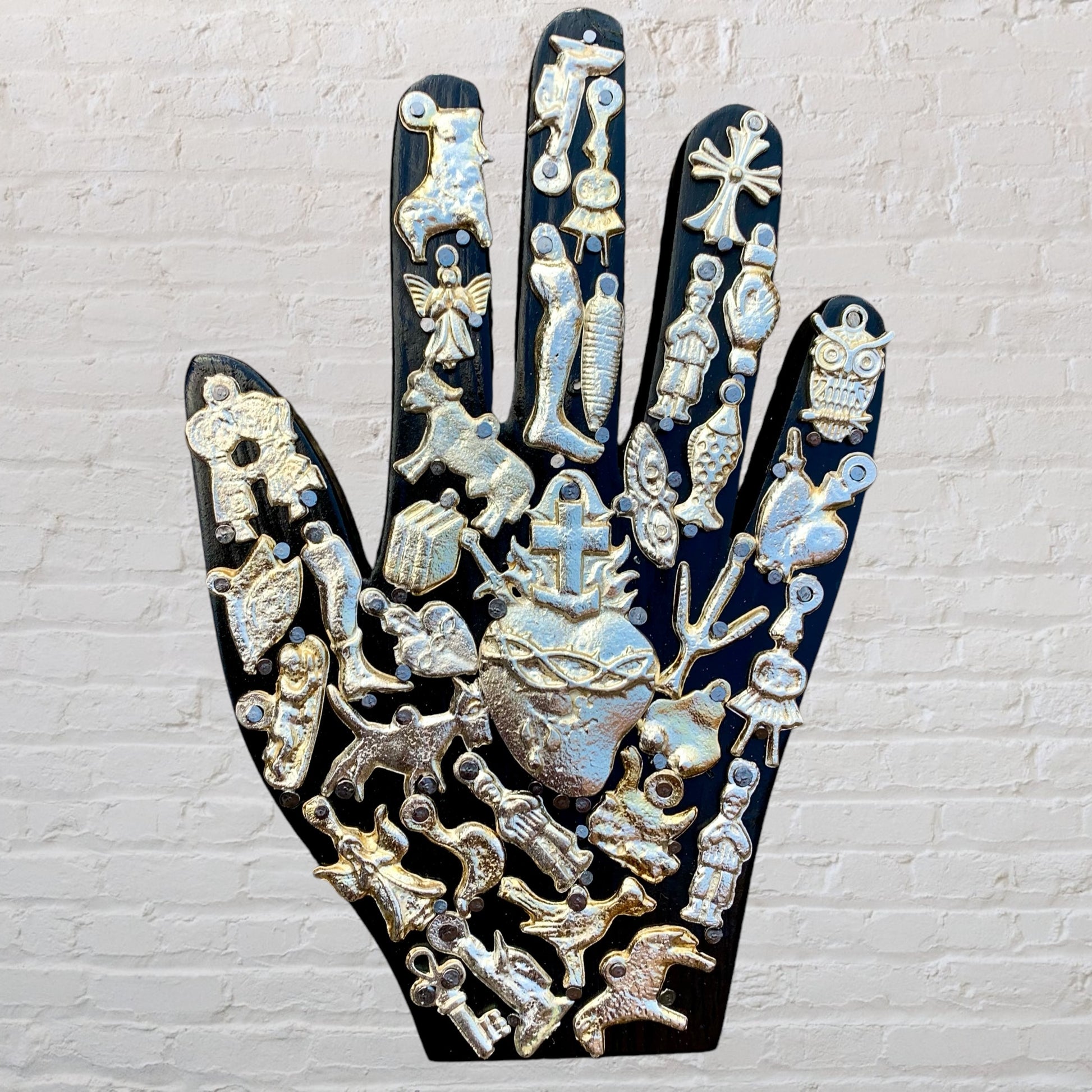 SHIPS FREE! This beautiful Milagros wood healing hand makes a unique, thoughtful gift. Our folk art wood hand is painted (color as shown in photo), and decorated with traditional Mexican Milagro charms. Hand crafted in Jalisco, Mexico.