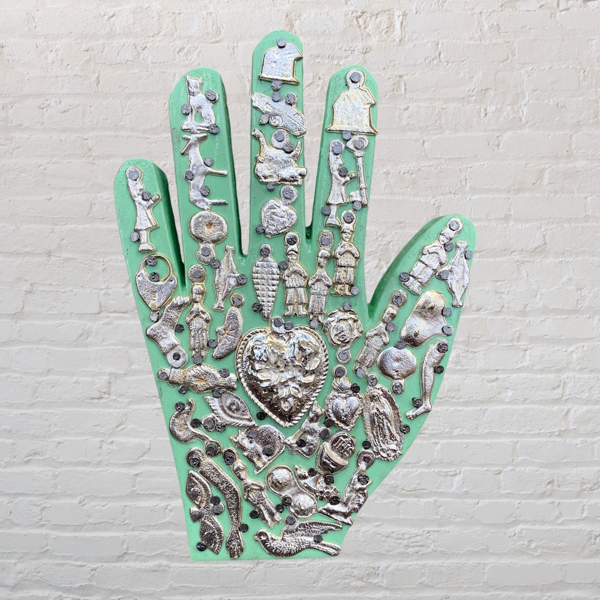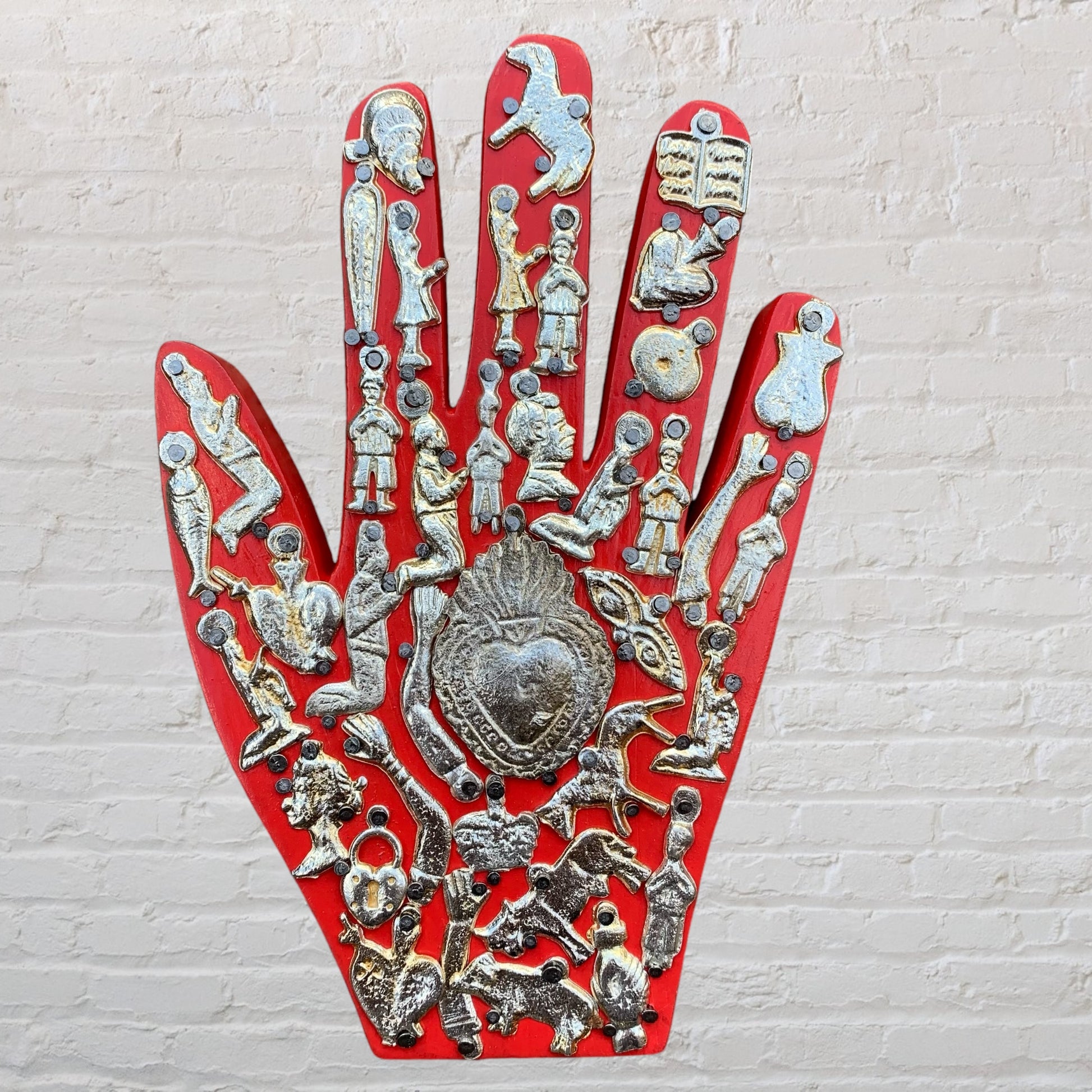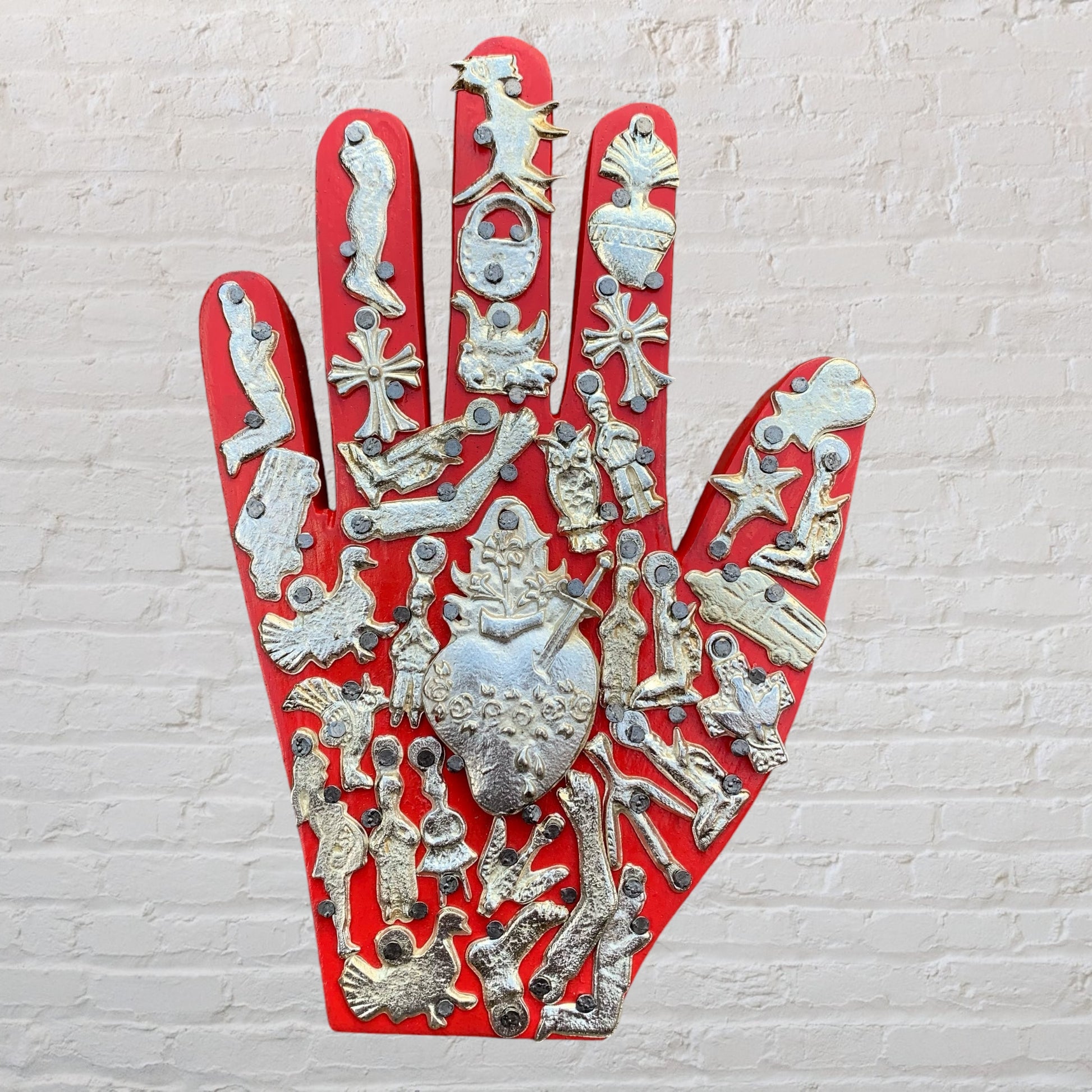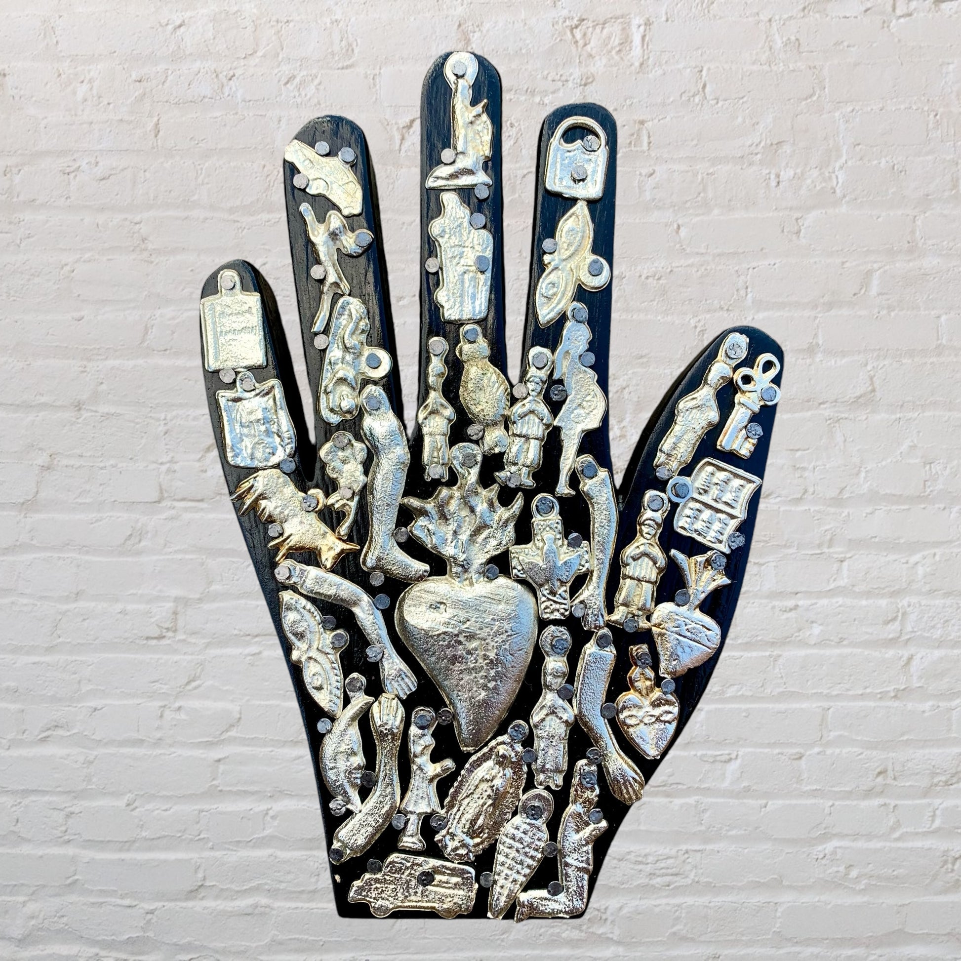 SHIPS FREE! This beautiful Milagros wood healing hand makes a unique, thoughtful gift. Our folk art wood hand is painted (color as shown in photo), and decorated with traditional Mexican Milagro charms. Hand crafted in Jalisco, Mexico.