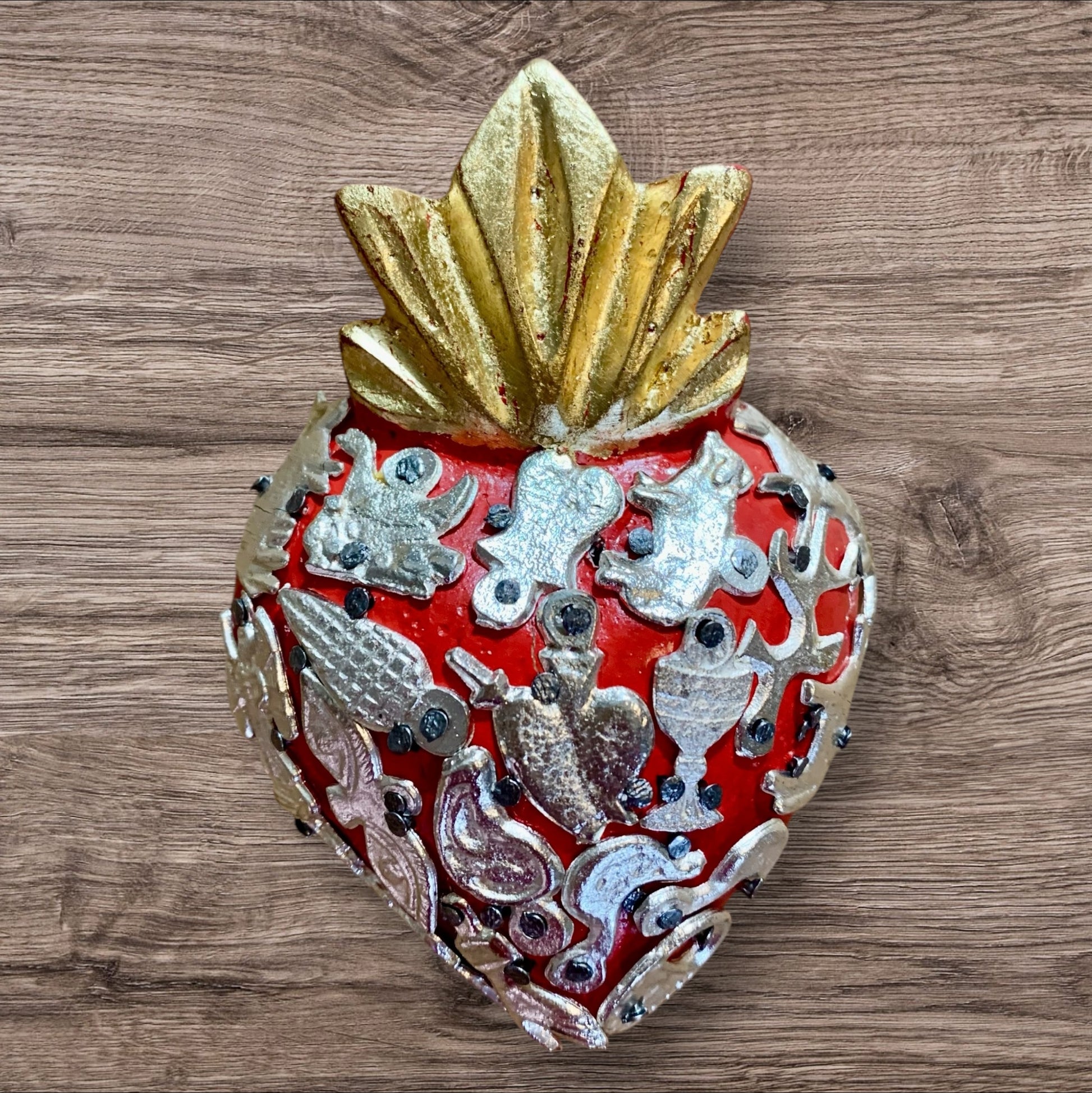 SHIPS FREE! Our beautiful small Milagros wood heart makes a unique gift for many special occasions, perfect for the Milagros folk art collector. The wood Heart is hand crafted (color as shown) and the stem is painted with a touch of gold. The heart is decorated with traditional Mexican Milagros charms. Our authentic Milagros folk art heart is from Guanajuato, Mexico.