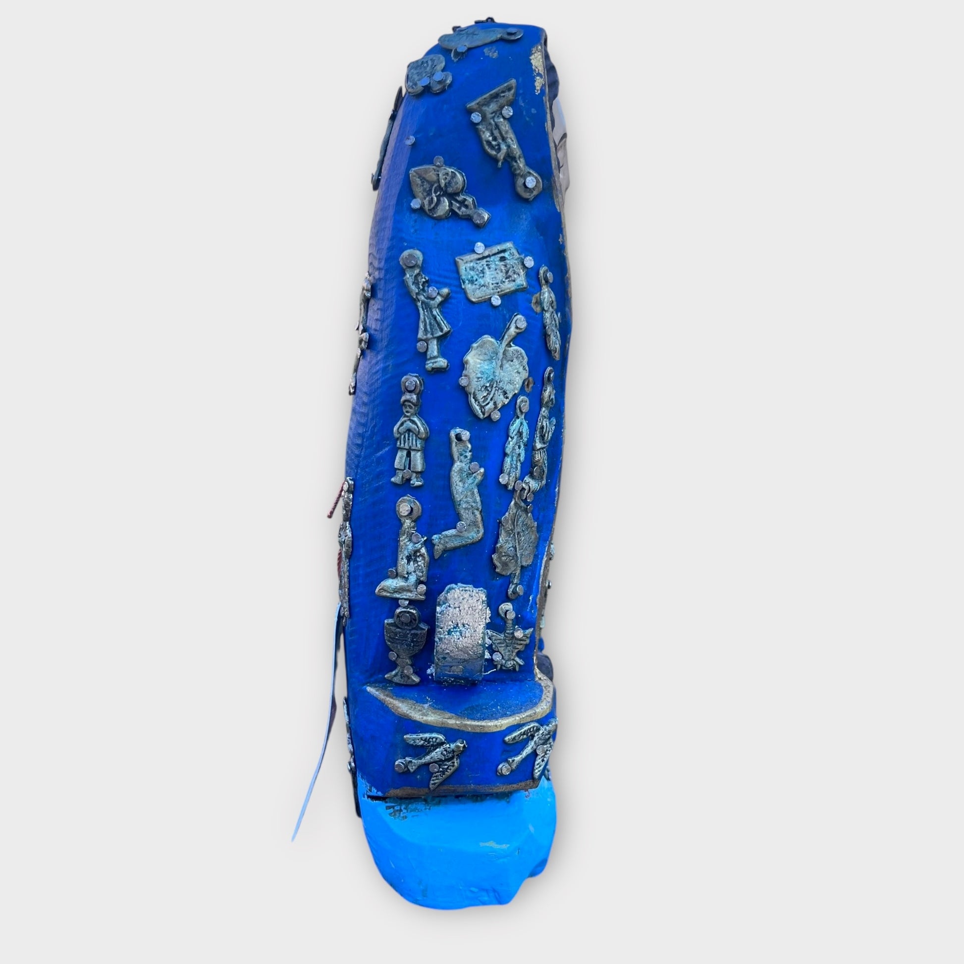 These Mexican handicrafts are made on pieces of wood decorated with metal figures know as "Milagros". This is an old religious tradition, giving thanks for the gifts of the heavens. This craft is represented as Mexican Folk Art. Irregularity in color and shape are characteristics of this craft.