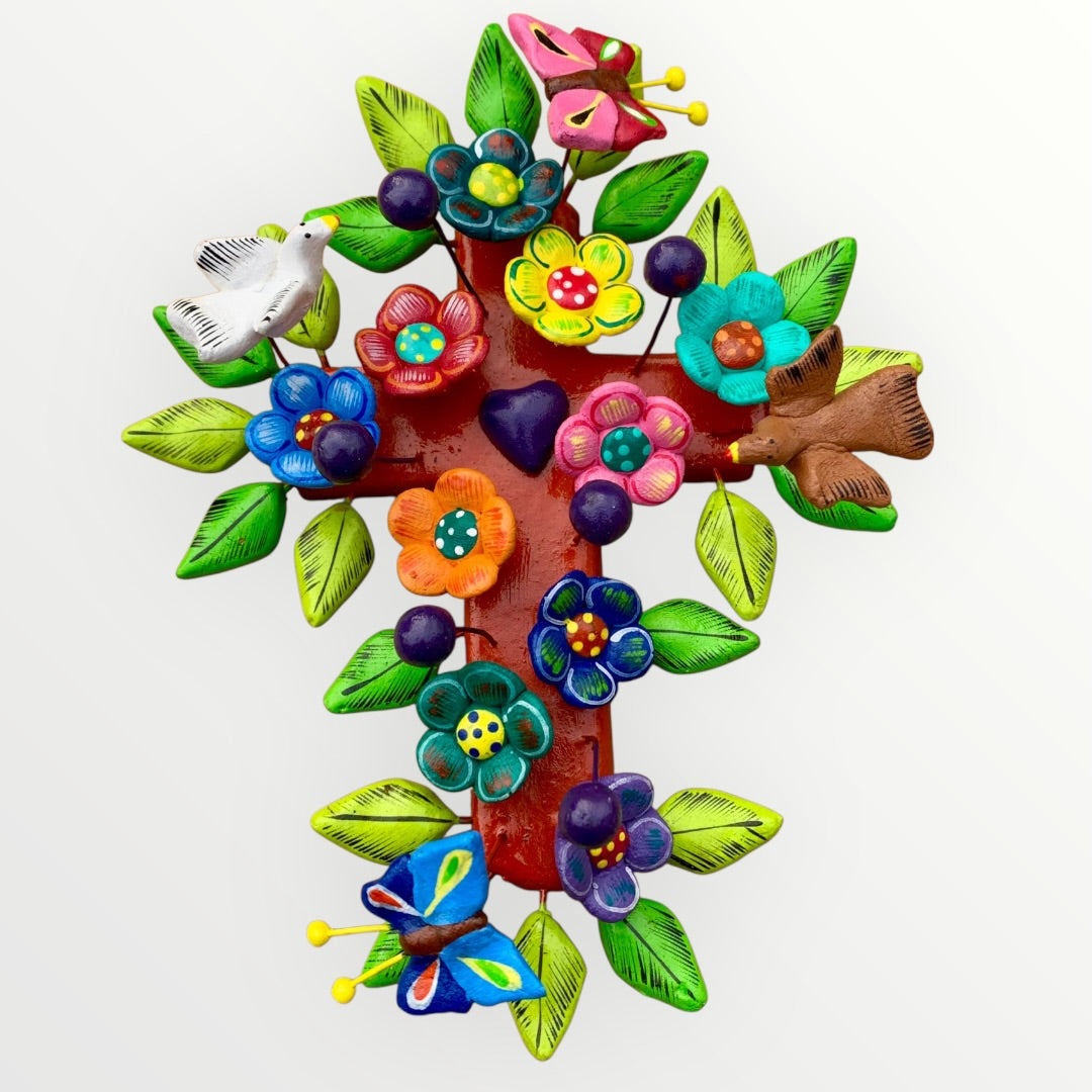 Eleuterio Ortega's beautiful handcrafted Clay Mexican Folk Art Cross is exceptional! The Ortega Family is known for their very colorful, cheerful folk art. This cross is adorned with individually painted flowers and leaves, with a heart in the center. Perfect for the lover of Mexican Traditional Folk Art. Signed by artist, has a loop on top for hanging. The cross is three dimensional and the color is as shown. Pottery Made in Tonala, Jalisco, Mexico.