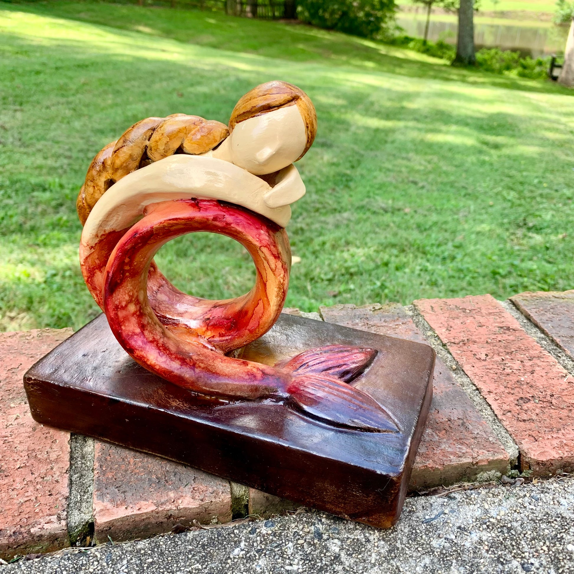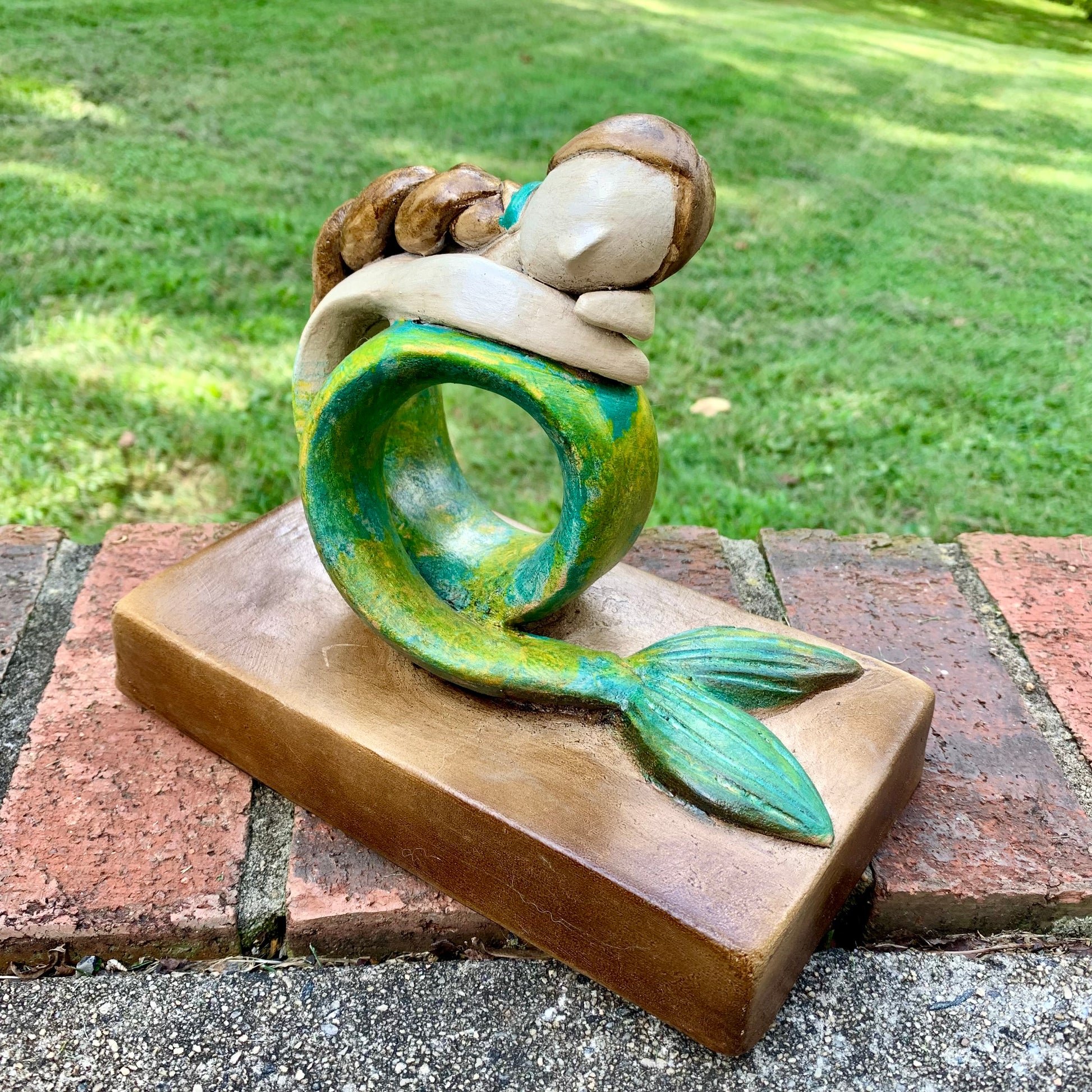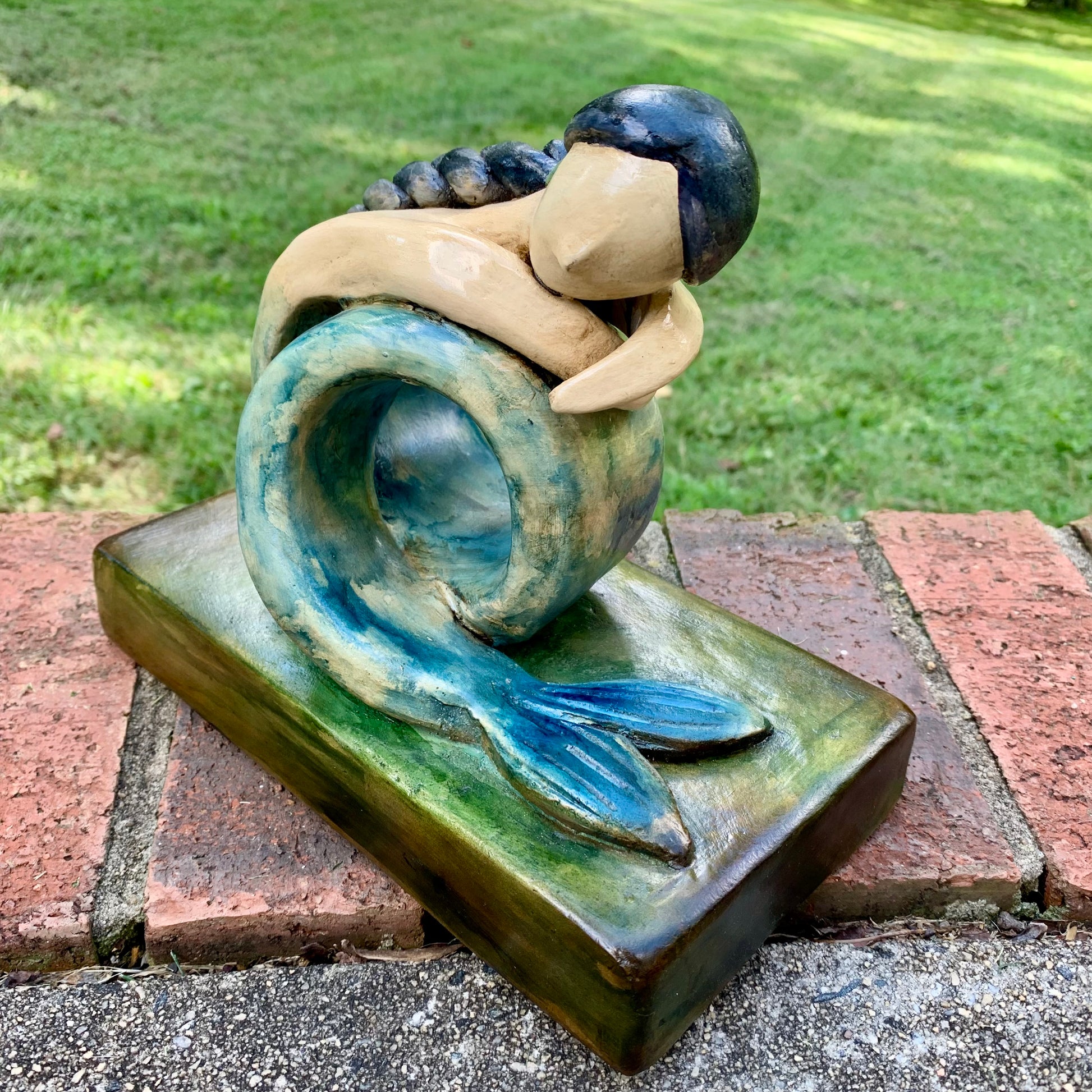Get swept away by the whimsical charm of Sweet Marina! This gorgeous pottery mermaid adds a touch of serene beauty to any room. Marina is peaceful, sitting on a base with her long, curled tail resting. Her long hair is neatly braided down her back. Simply a sweet sculpture.