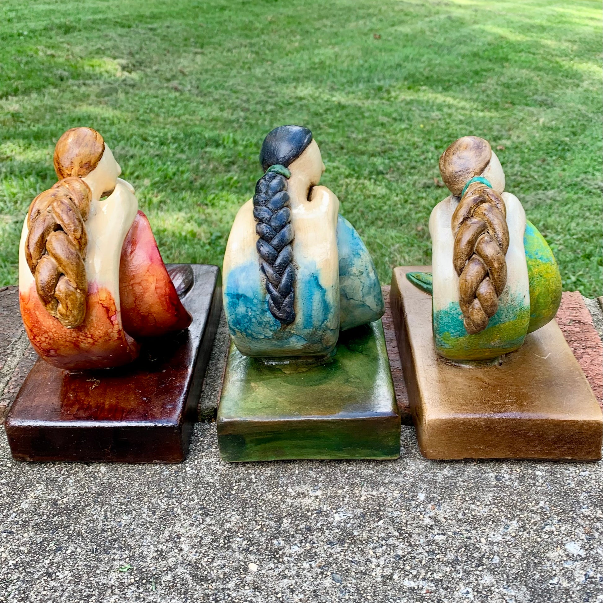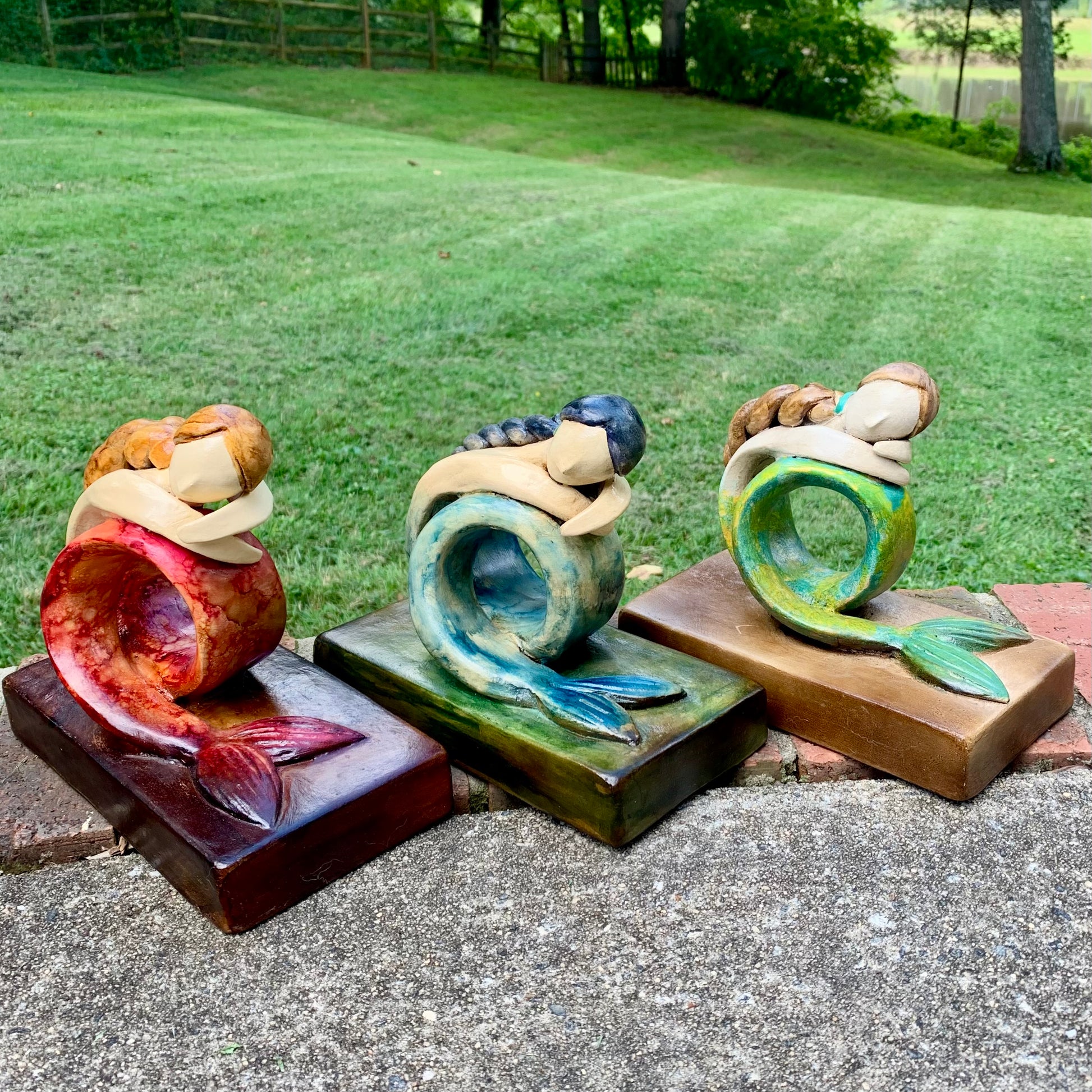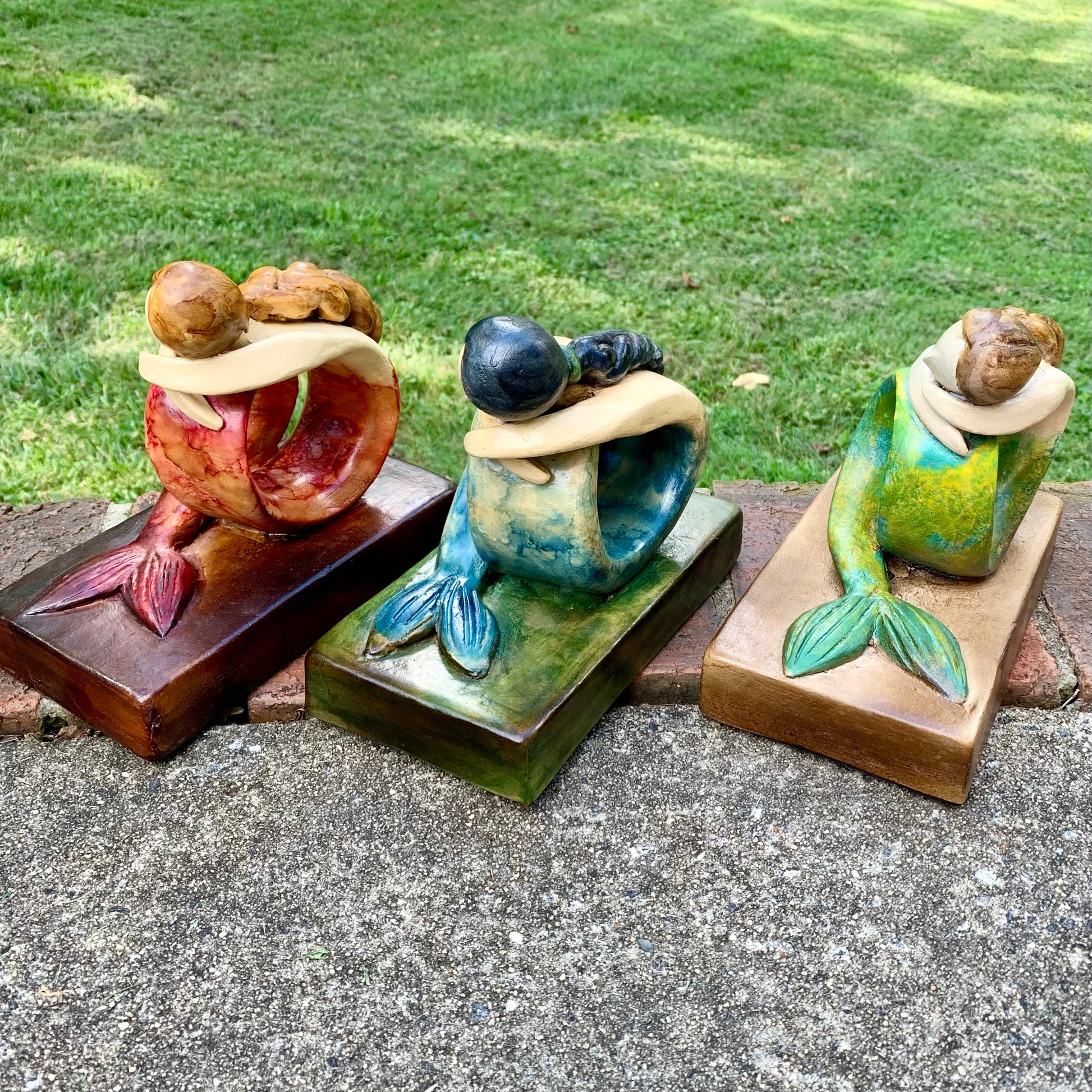 Get swept away by the whimsical charm of Sweet Marina! This gorgeous pottery mermaid adds a touch of serene beauty to any room. Marina is peaceful, sitting on a base with her long, curled tail resting. Her long hair is neatly braided down her back. Simply a sweet sculpture.