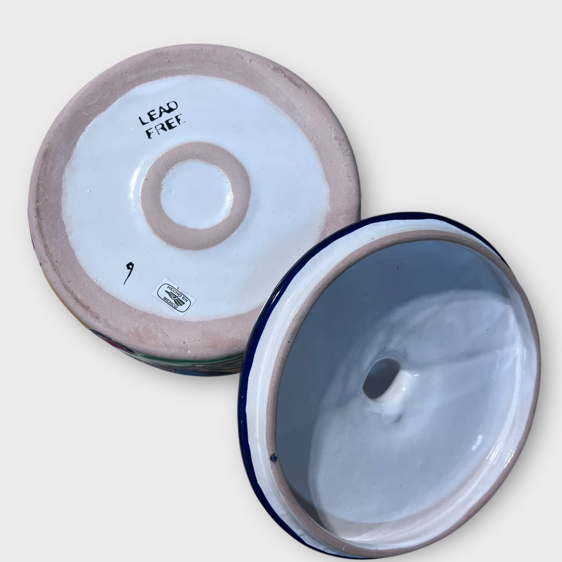 Our Talavera Tortilla Warmer is perfect for keeping those tortillas toasty! For extra warmth, line with a linen napkin and use the cover. Not just for tortillas, use for vegetables, soups, sauces and more. Our Tortilla Warmer makes a thoughtful gift for housewarmings, engagements, weddings and other special occasions! This Talavera piece will be enjoyed for years! A work of art! Handcrafted in Delores Hildago, Mexico.