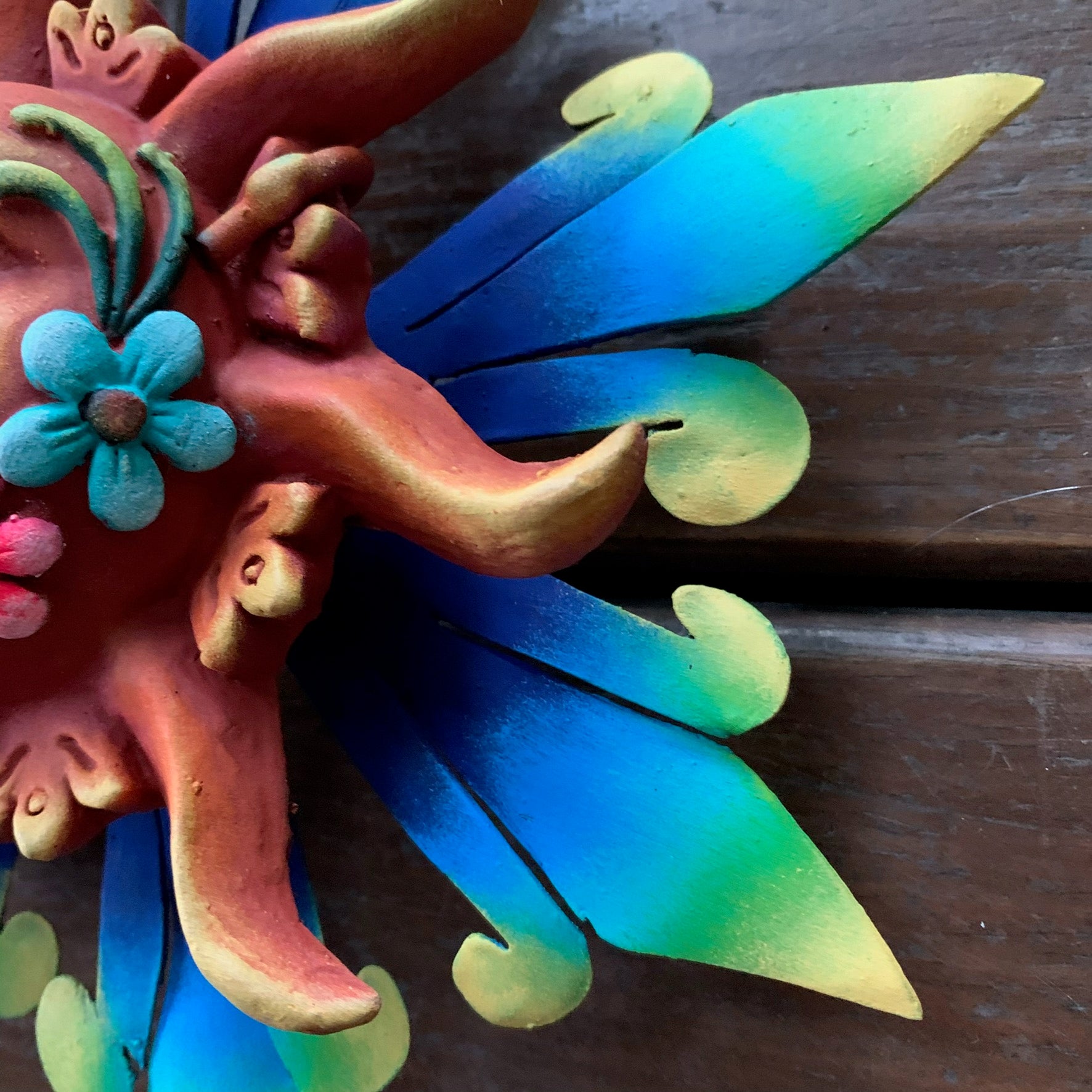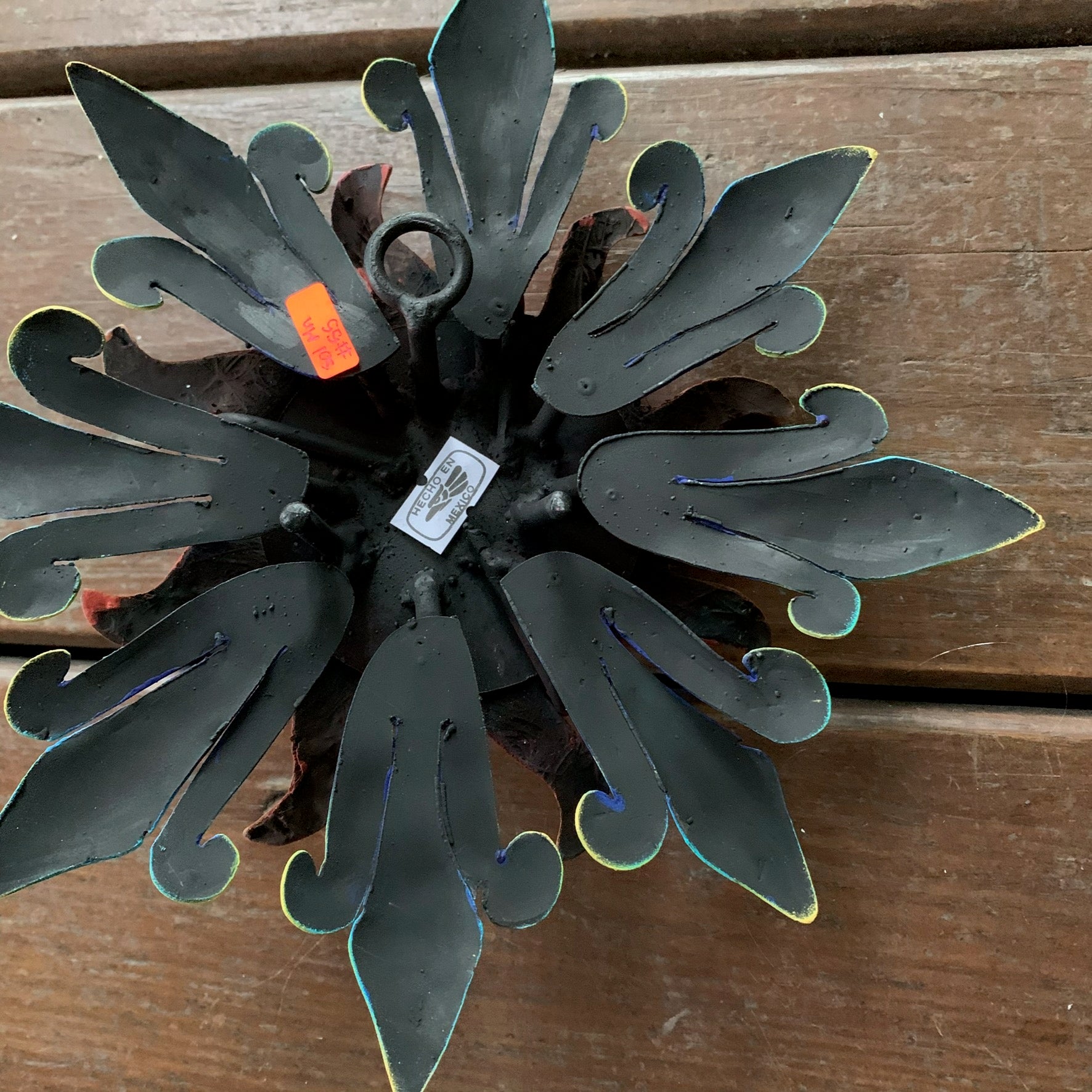 Our Floral Sun is looking pretty cozy and happy. What a unique and colorful sun! The flowers offer a sign of spring and renewal. This unique sun is hand crafted with painted metal rays and a fiberglass face . May be enjoyed indoors and outdoors. Has a loop on back for easy hanging. This piece is light weight and easy to hang. Made in Tonala, Jalisco, Mexico Sun#55