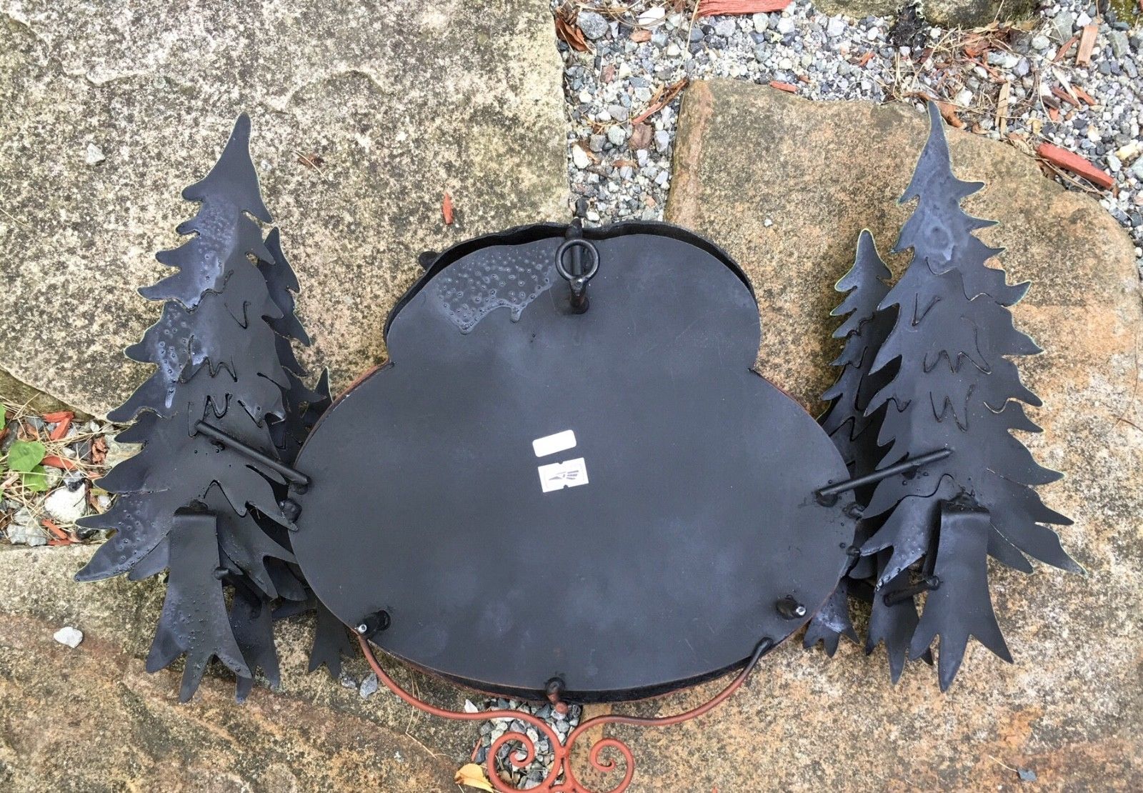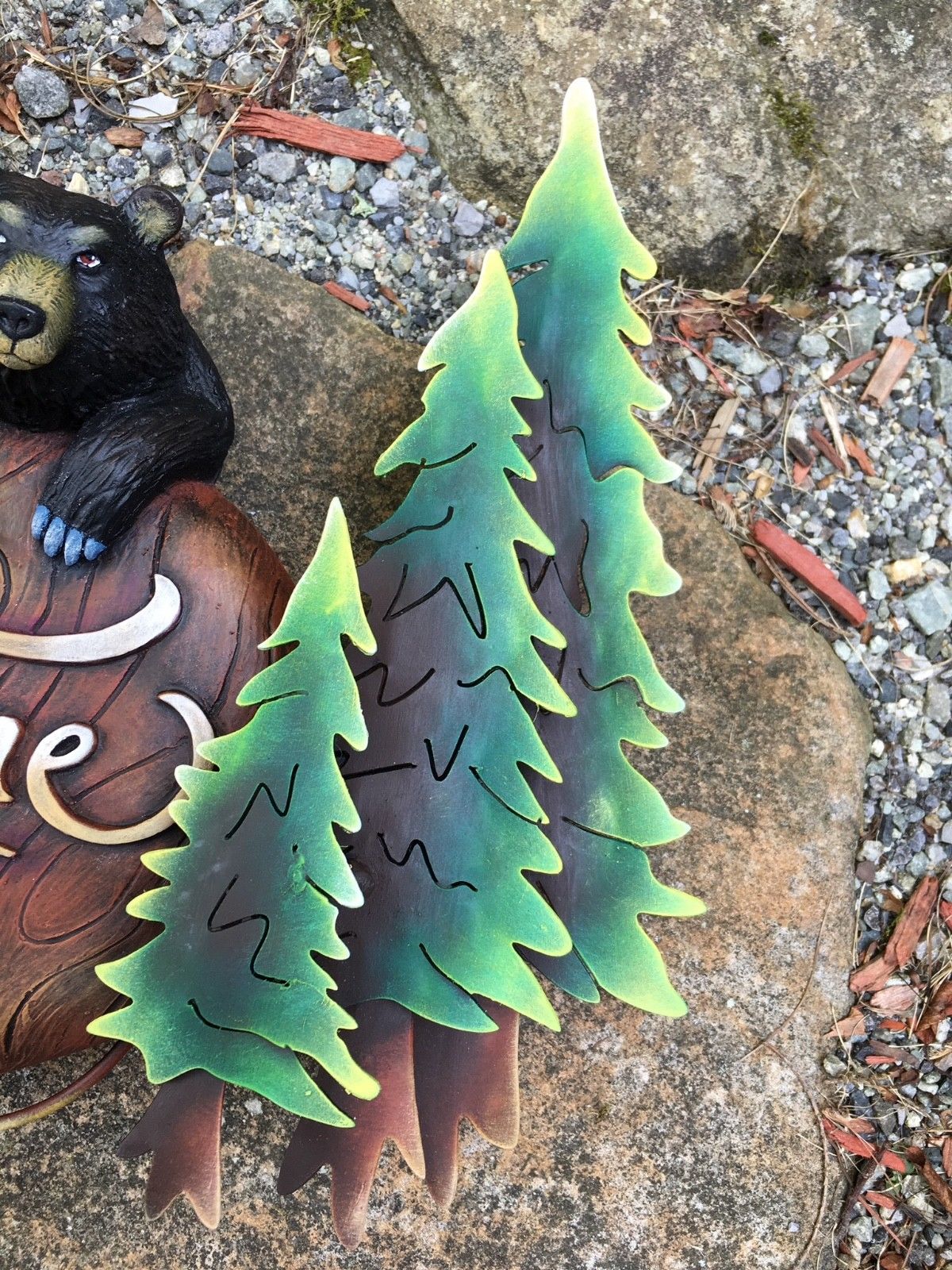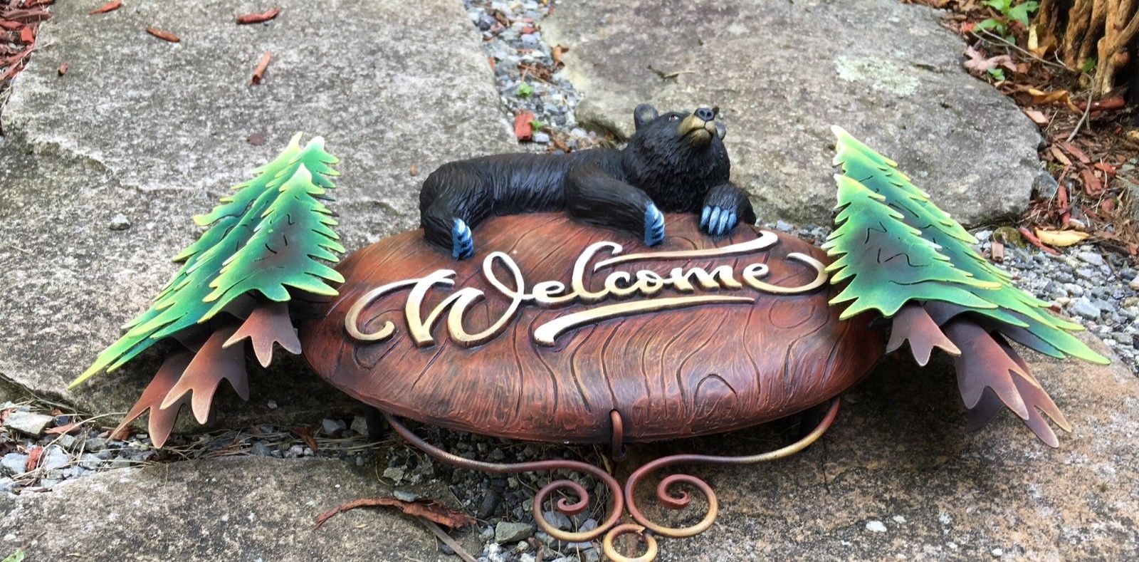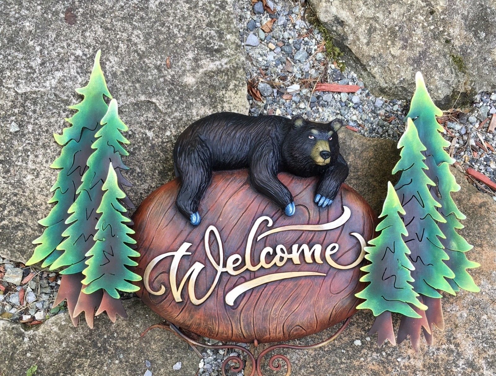 This is truly unique! Our wall mounted "Black Bear Welcome Sign" is a playful addition to any rustic home or garden.  Wonderful for a cabin or mountain home. This sculpture can be used indoors or outdoors. The trees are crafted in metal, the "Welcome" sign and bear are fiberglass.